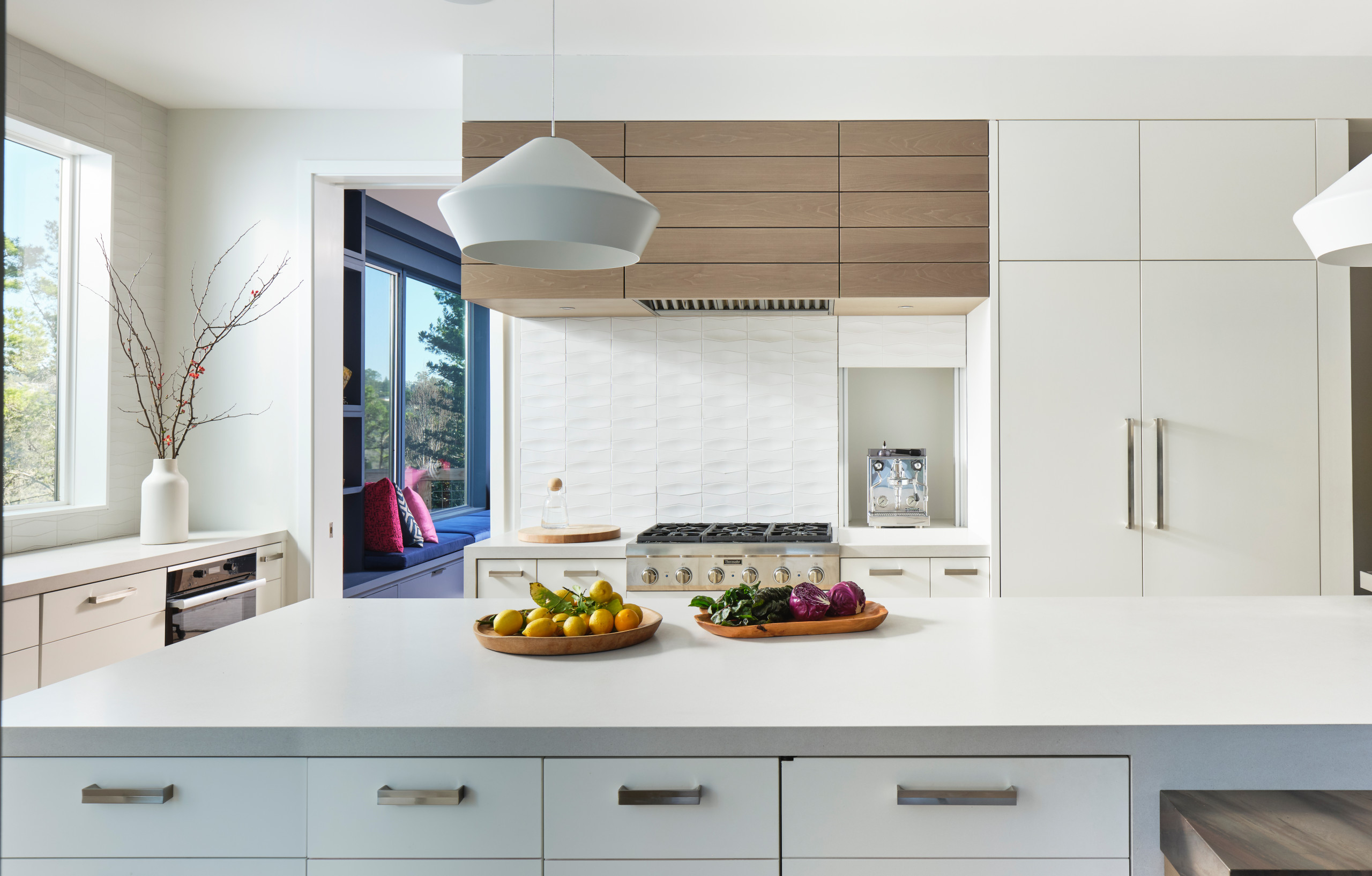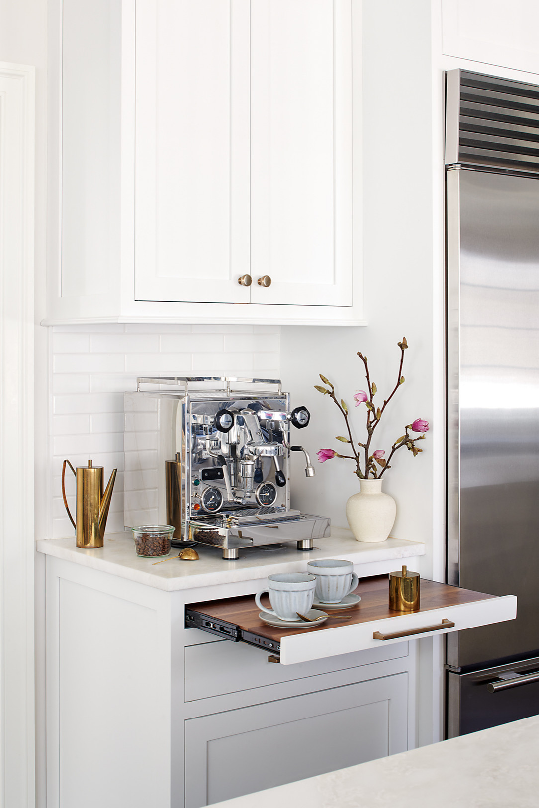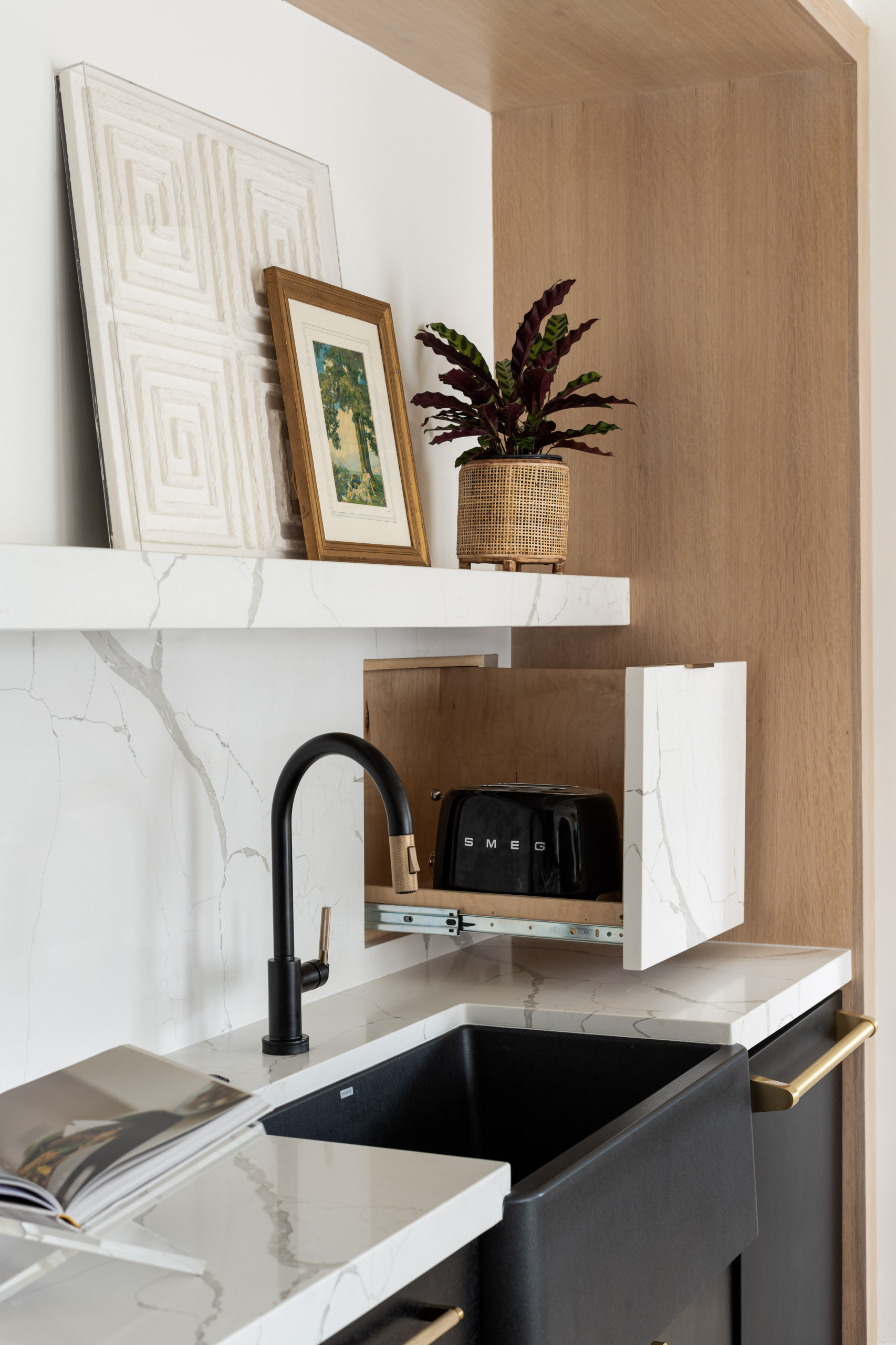 The sink backsplash in this Providence, Rhode Island, kitchen by Alex Interiors has a secret: a toaster hides in an integrated drawer. When closed, it’s only identifiable by a tiny tab pull.