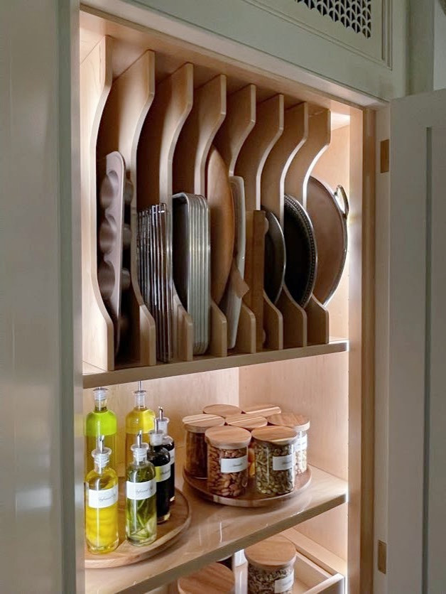 Divided lower cabinets make accessing cutting boards and cookie sheets easier than when they’re piled on top of each other, but the boards can be awkward to pull out without squatting down. This tilt-out lower cabinet uploaded by Everingham Design makes grabbing a board more ergonomic.