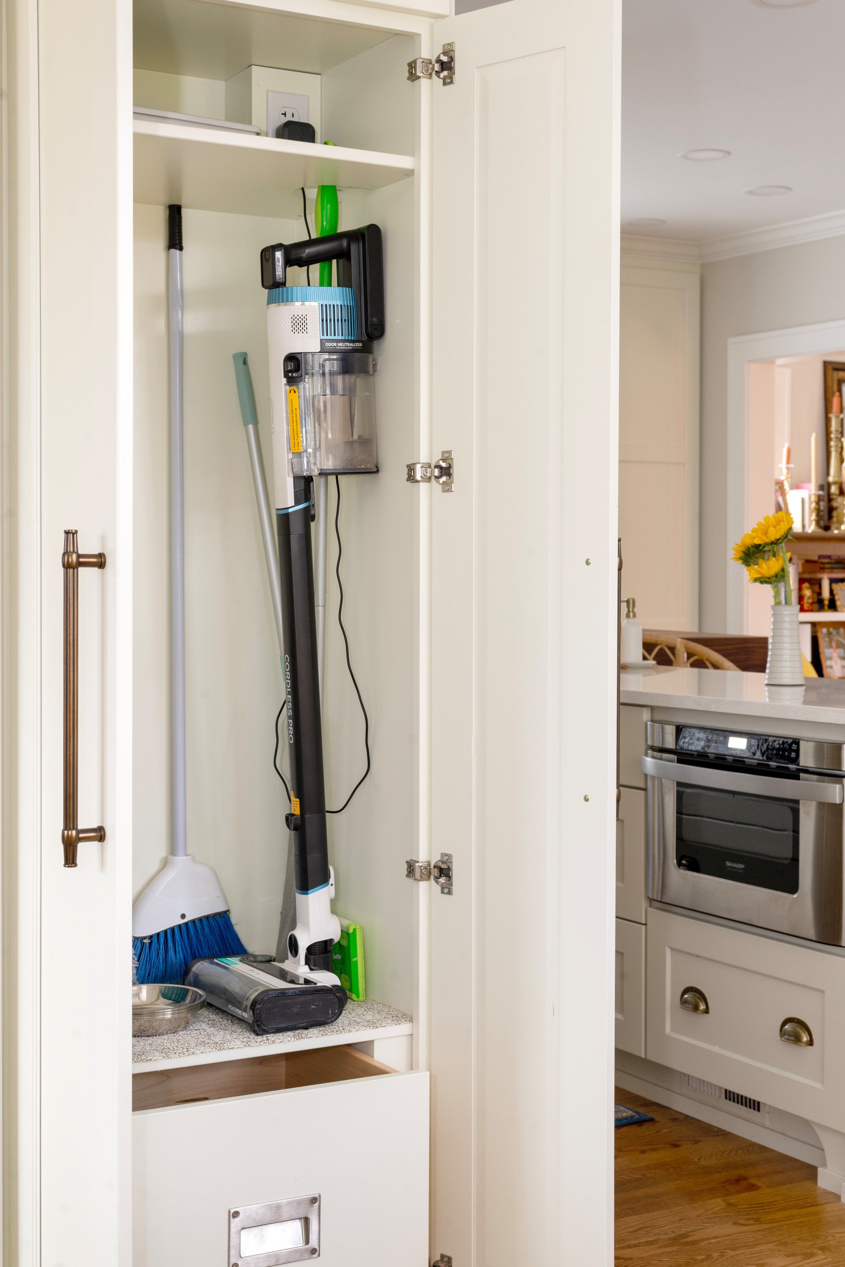 In another Pennsylvania project, You-Neek Designs used a shallow, tall cabinet at the end of a cabinet run to create vacuum storage, complete with an outlet for plugging in the charger.