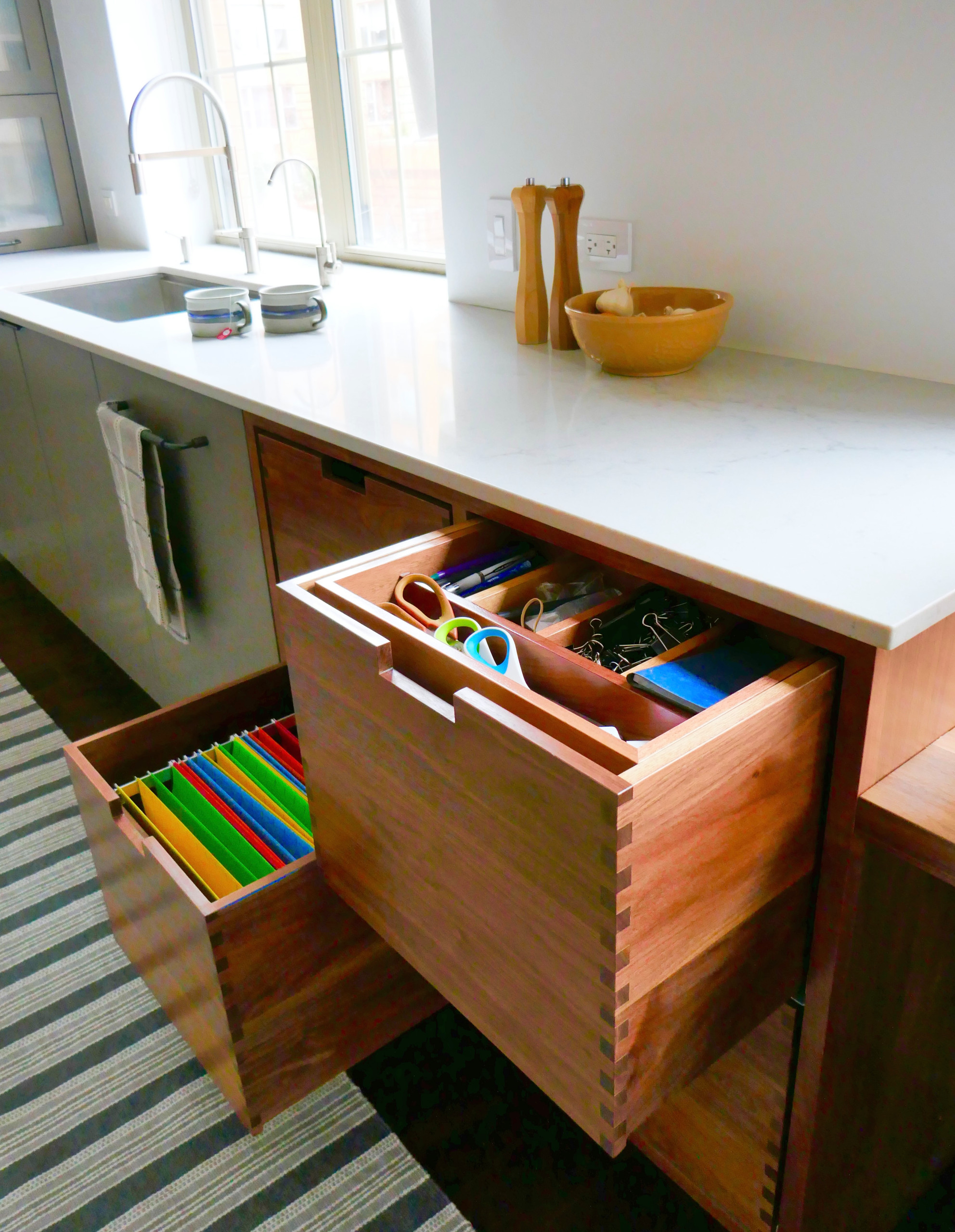 Paperwork, office supplies and thingamajigs tend to accumulate in a kitchen, whether or not it doubles as an office. These beautifully dovetailed drawers in a New York City townhouse designed by One to One Studio enforce order on the dreaded piles and the overflowing junk drawer.