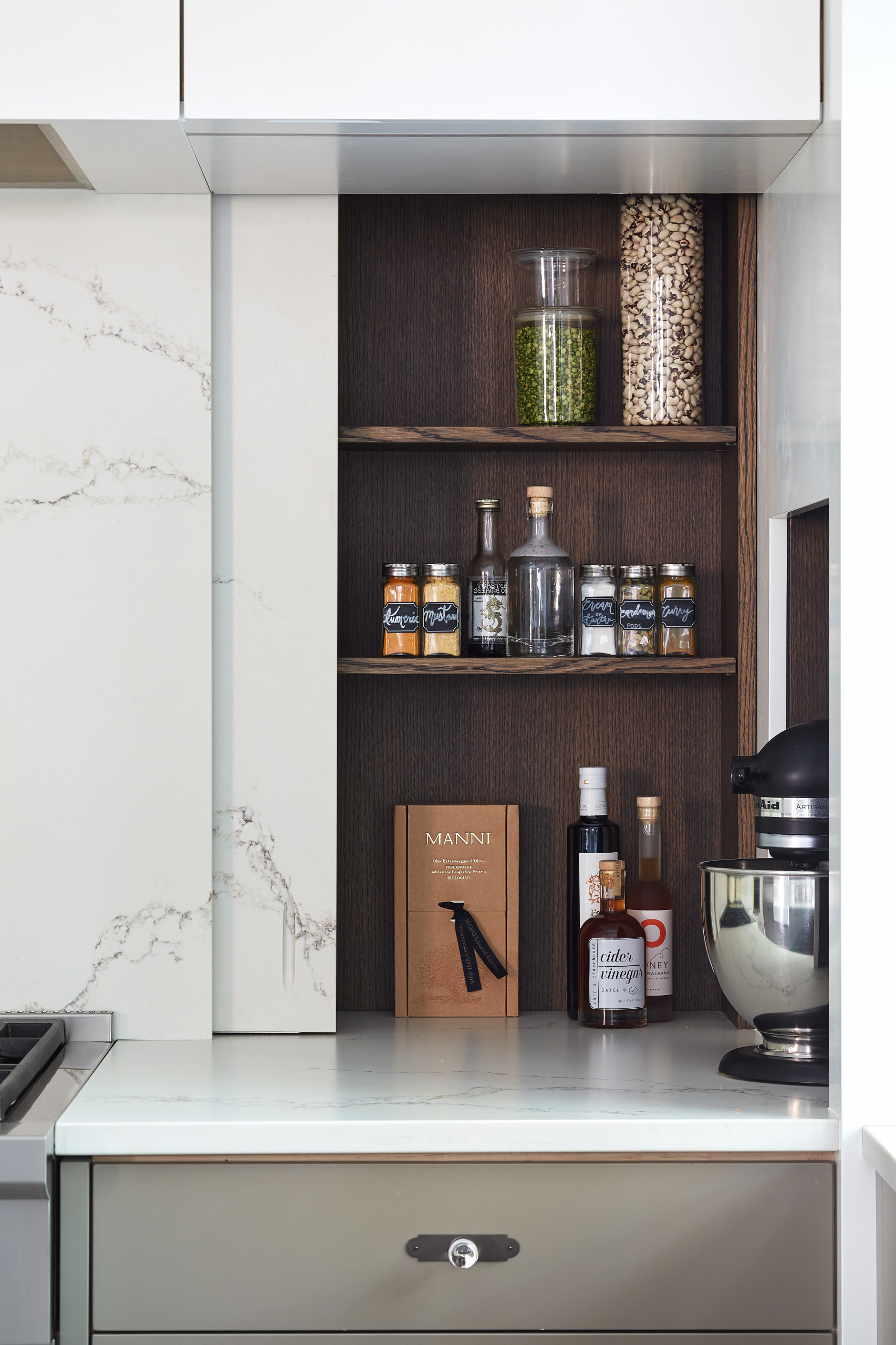 When closed, this sliding section of solid slab makes these small jars and bottles disappear. In a Cambridge, Massachusetts, kitchen by Koo de Kir, the design gives the backsplash a nearly seamless, uncluttered look.