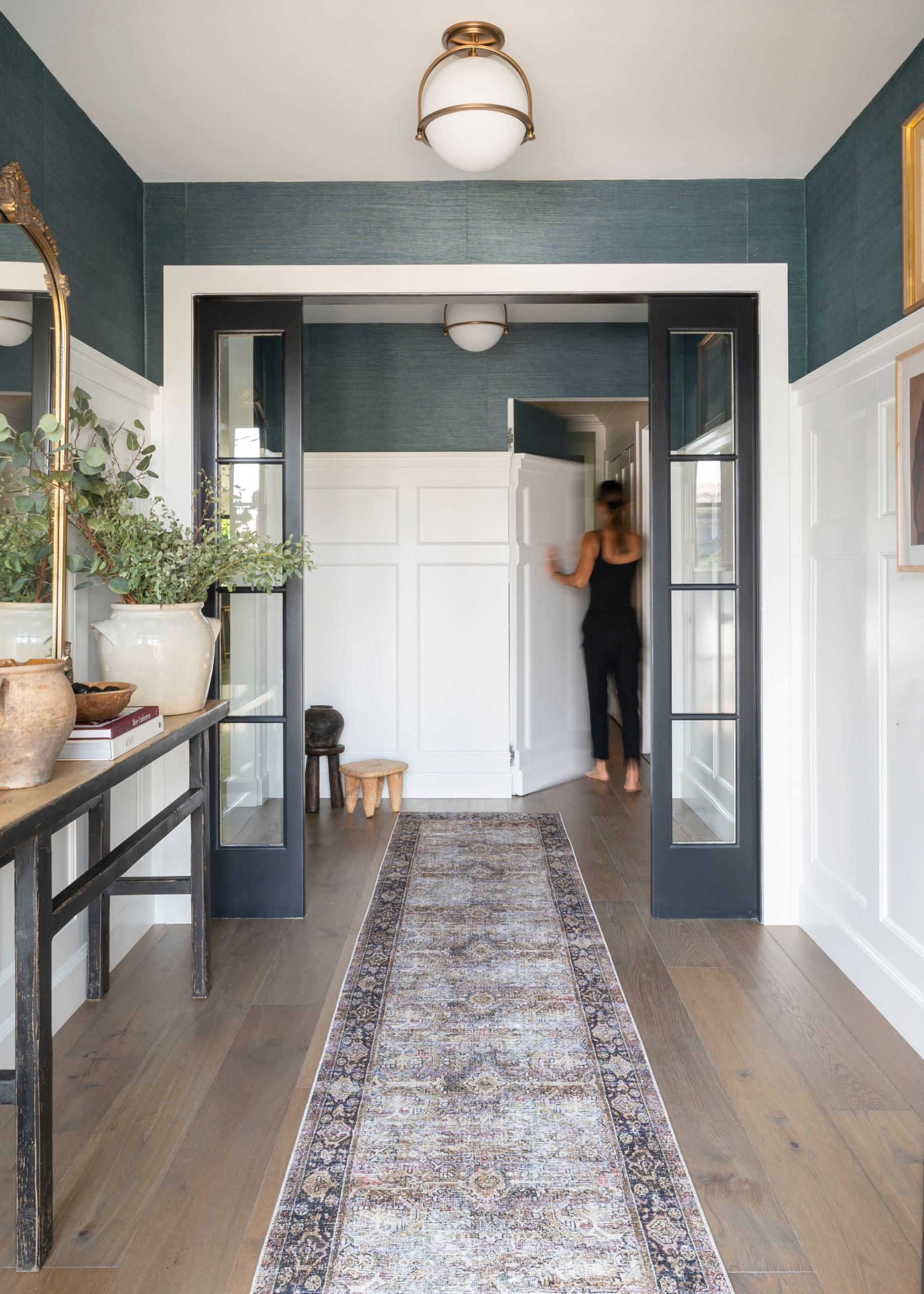 Designer Natalia Avalos wanted to keep this California foyer feeling formal and preserve the uniform look of its new paneling. But she also wanted to add access to a hallway that leads to a powder room and garage. She achieved it all — and added a fun surprise factor — with a camouflaged door.