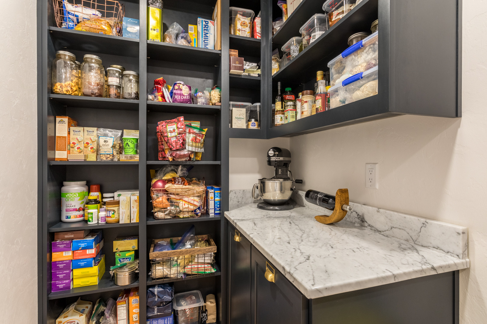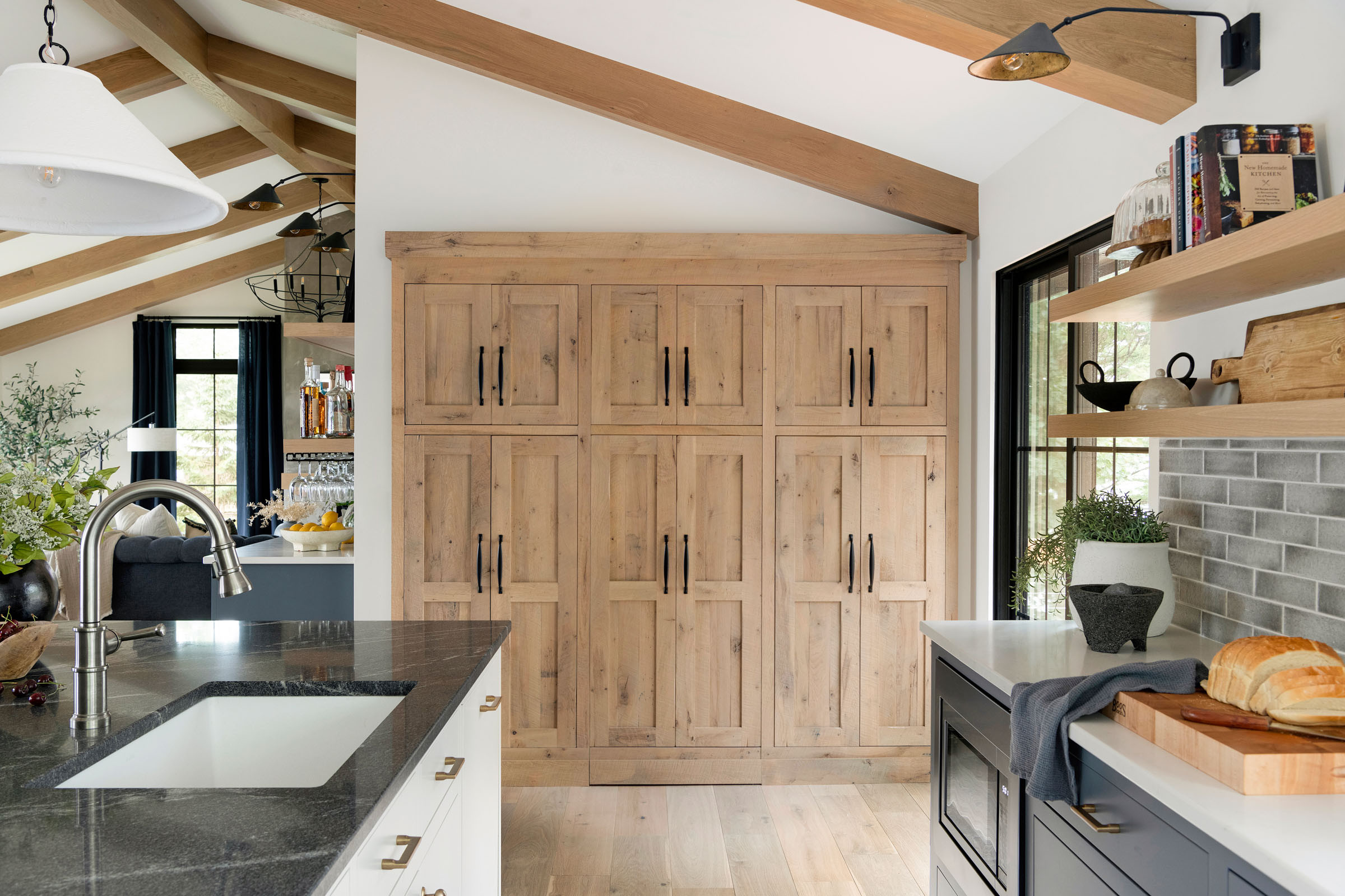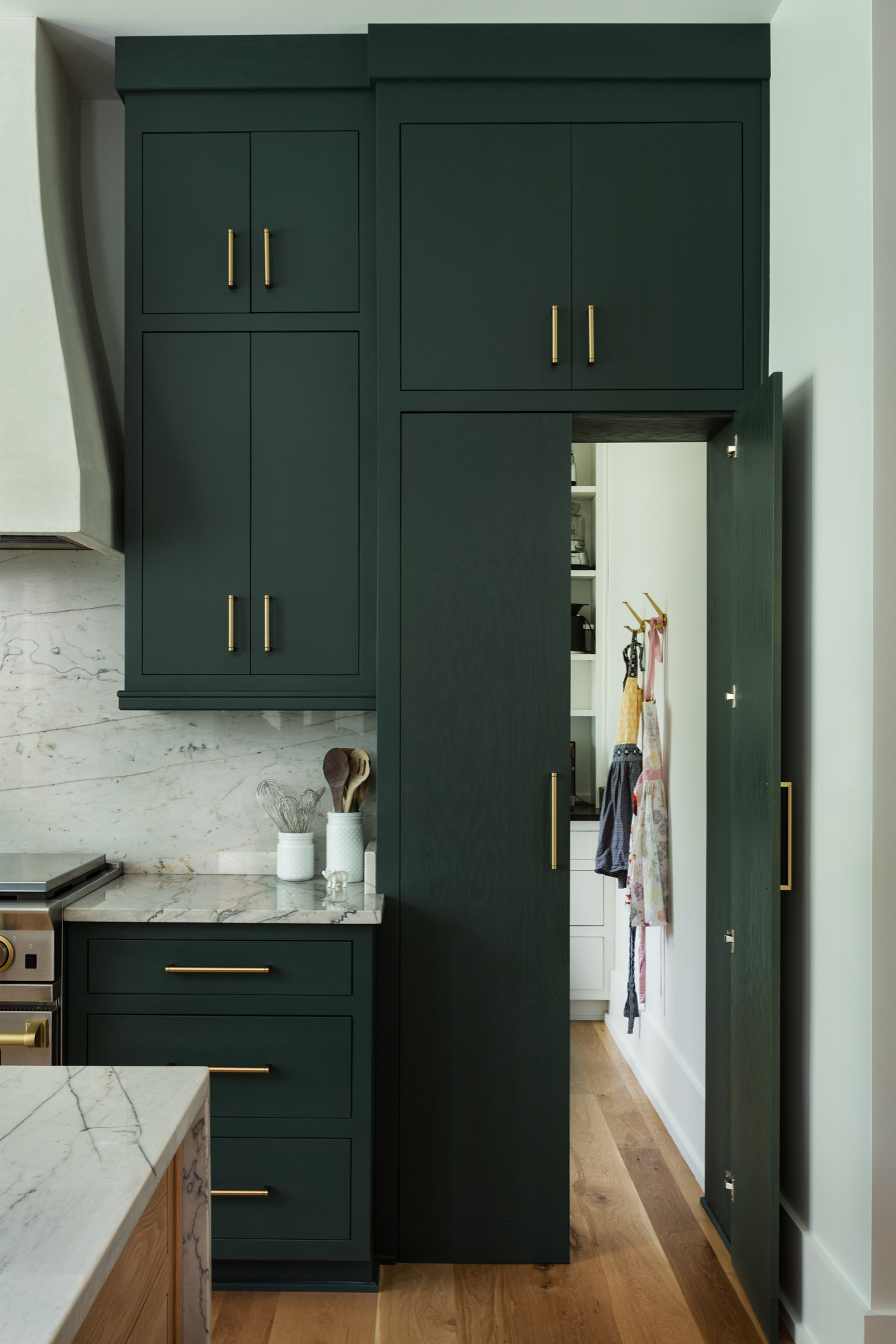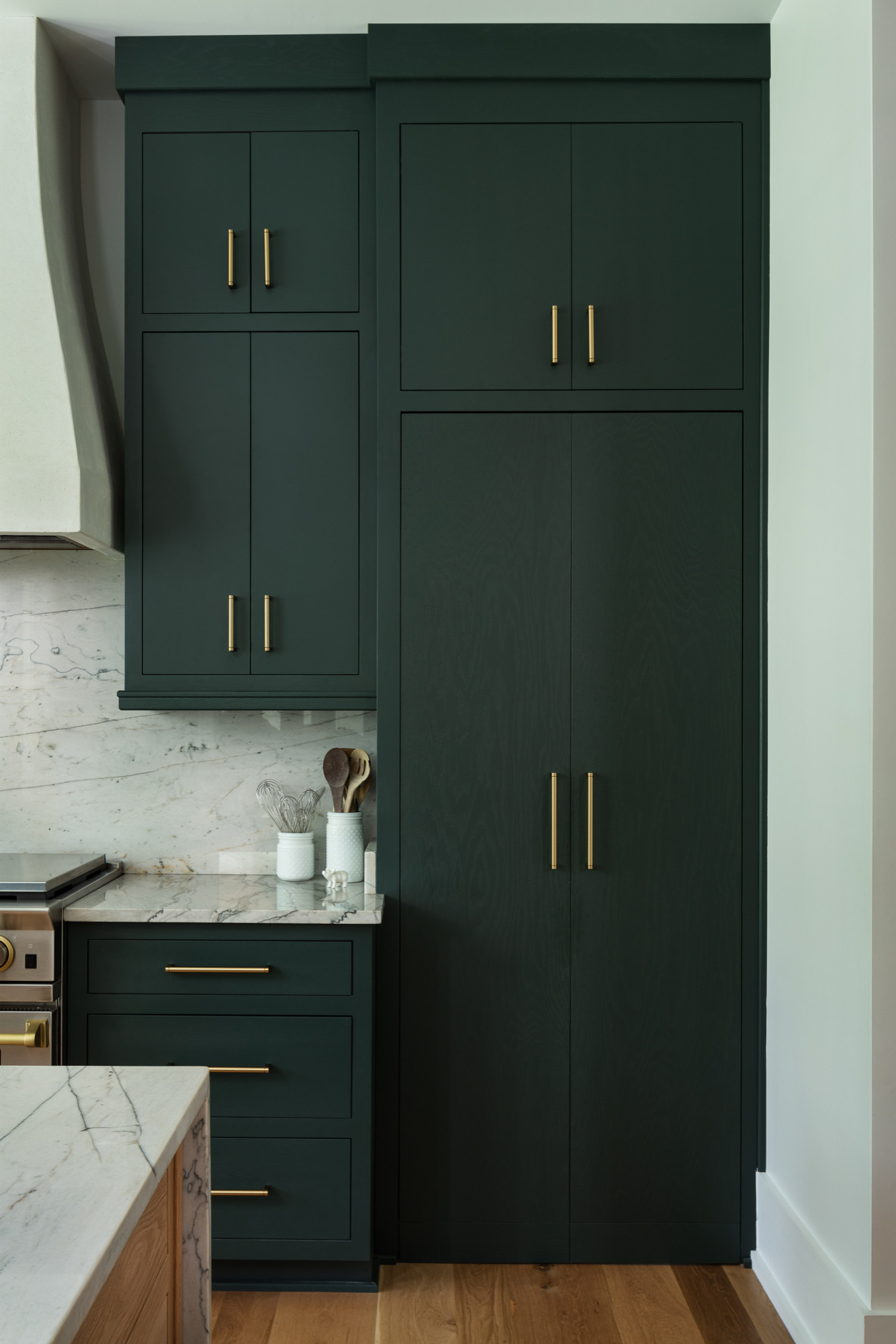 The cabinetry wraps around the kitchen, and concealing the pantry with a matching front helps it look cohesive and complete. When the door’s closed, you’d never know there’s an entire room inside.