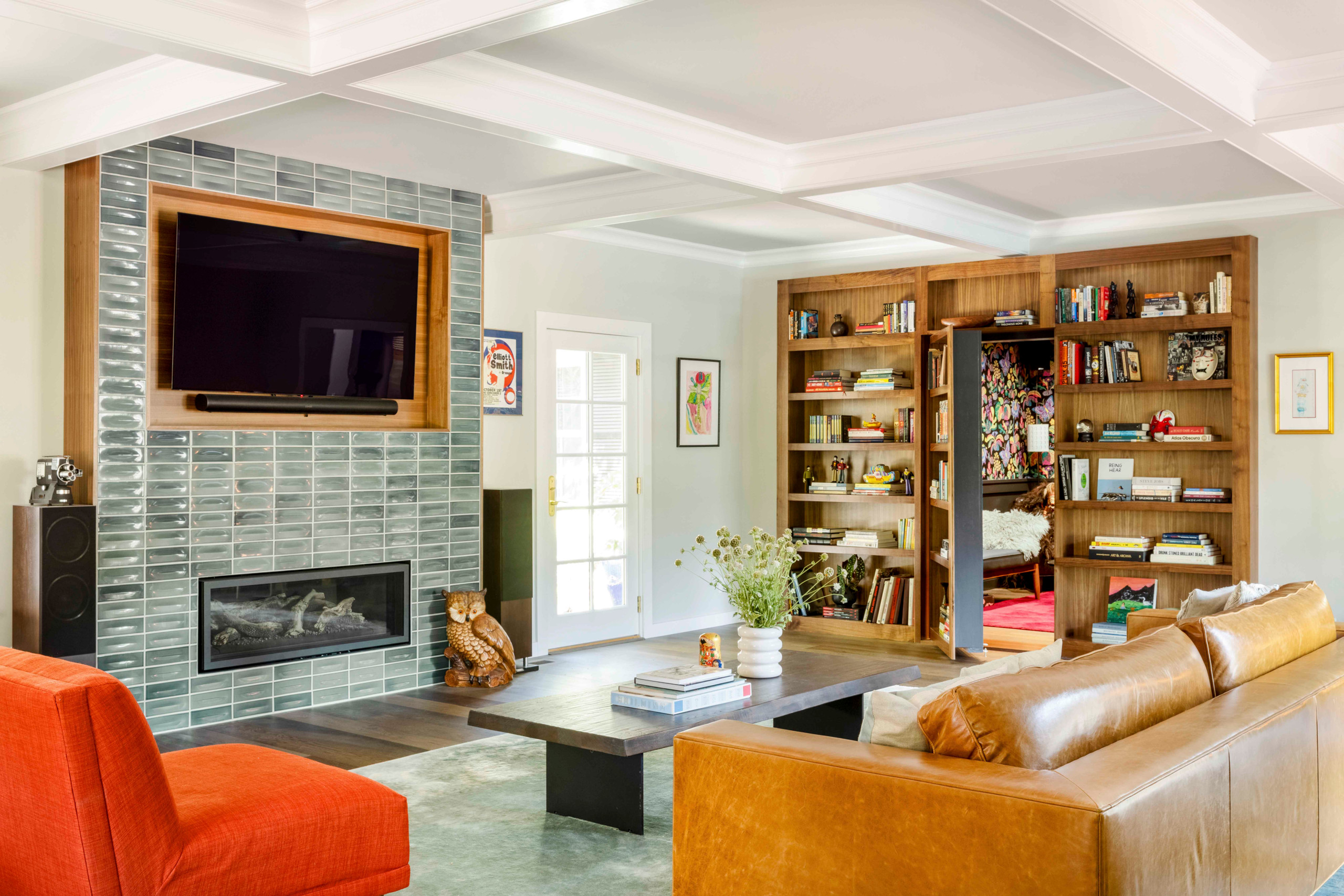 Given the playful, slightly offbeat colors and accessories in this San Francisco living room, a hidden door in the bookcase seems totally on-theme.
