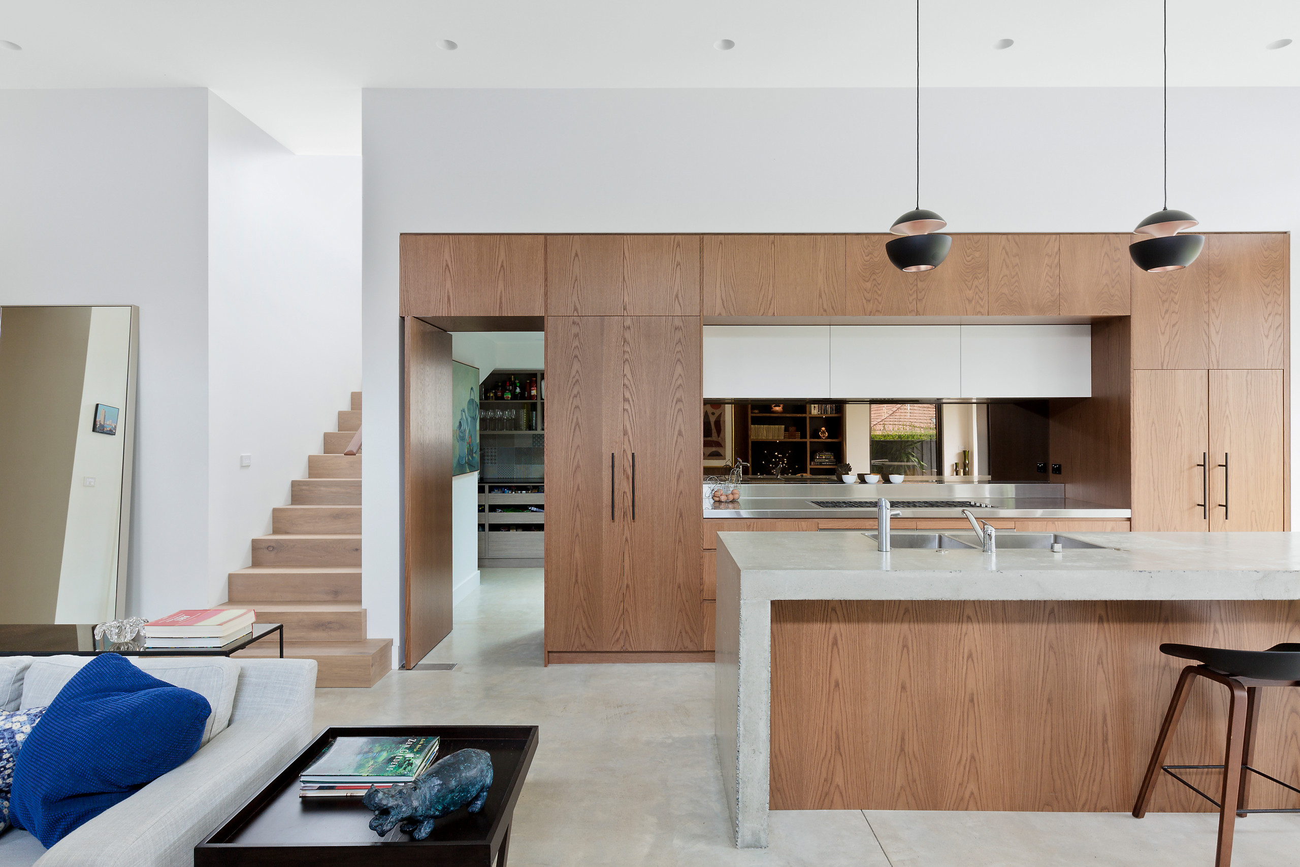 Another Australian kitchen — this one designed by Annabelle Chapman Architect — has a reflective backsplash that makes it look like you can see into another room behind the cooktop.