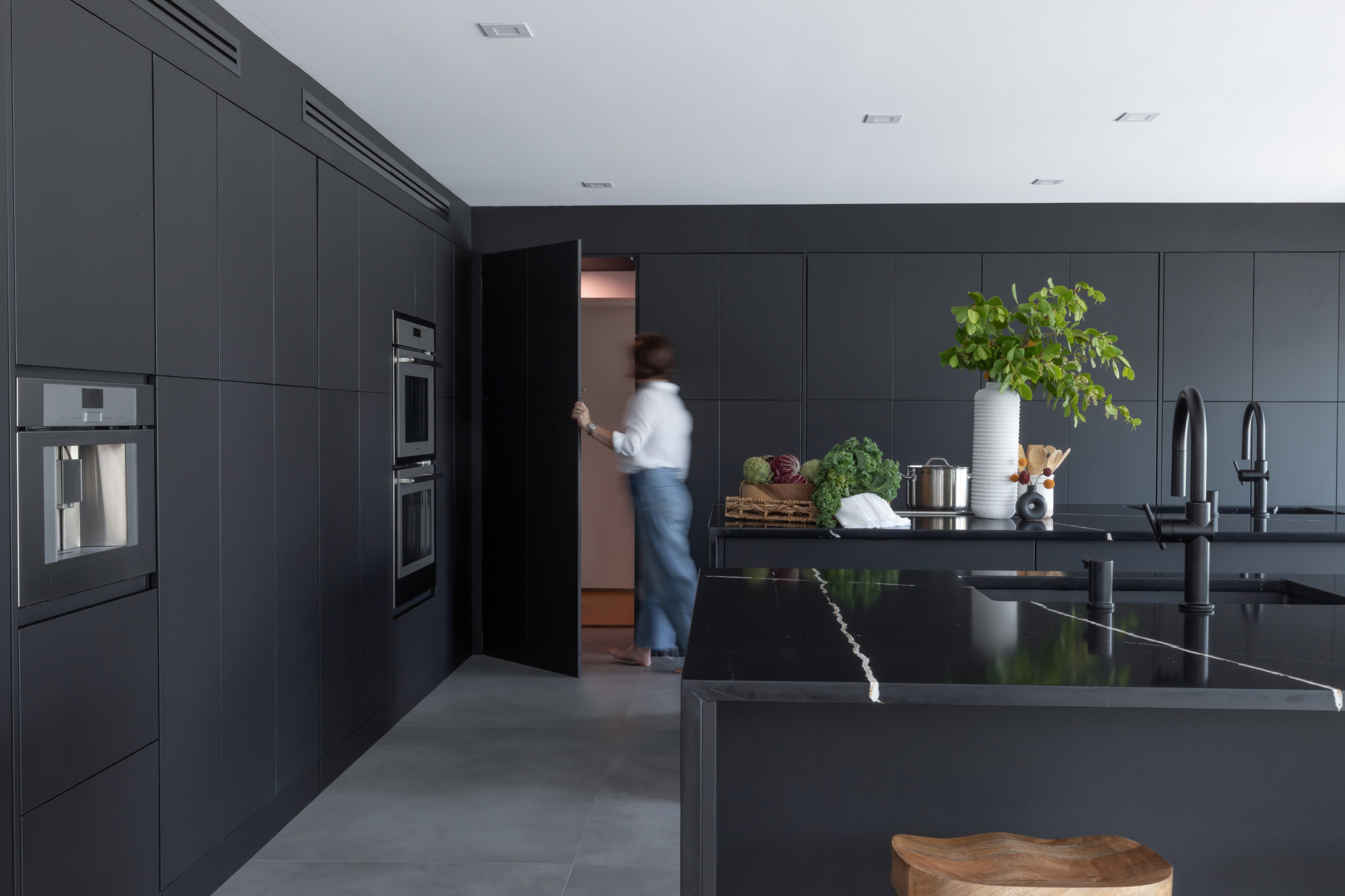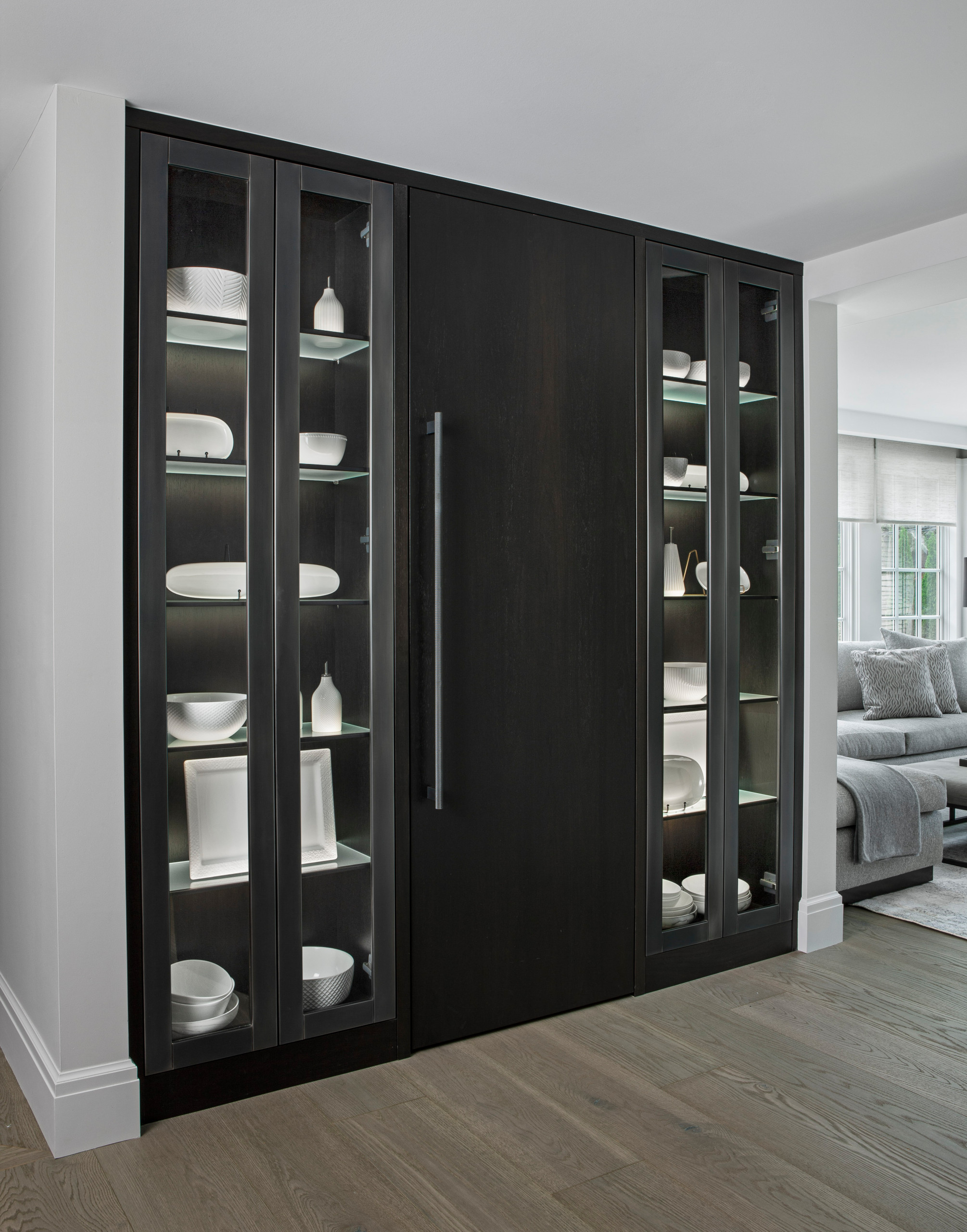 Slim black pulls and hinges indicate the doors’ locations without interrupting the paneling’s clean vertical lines.