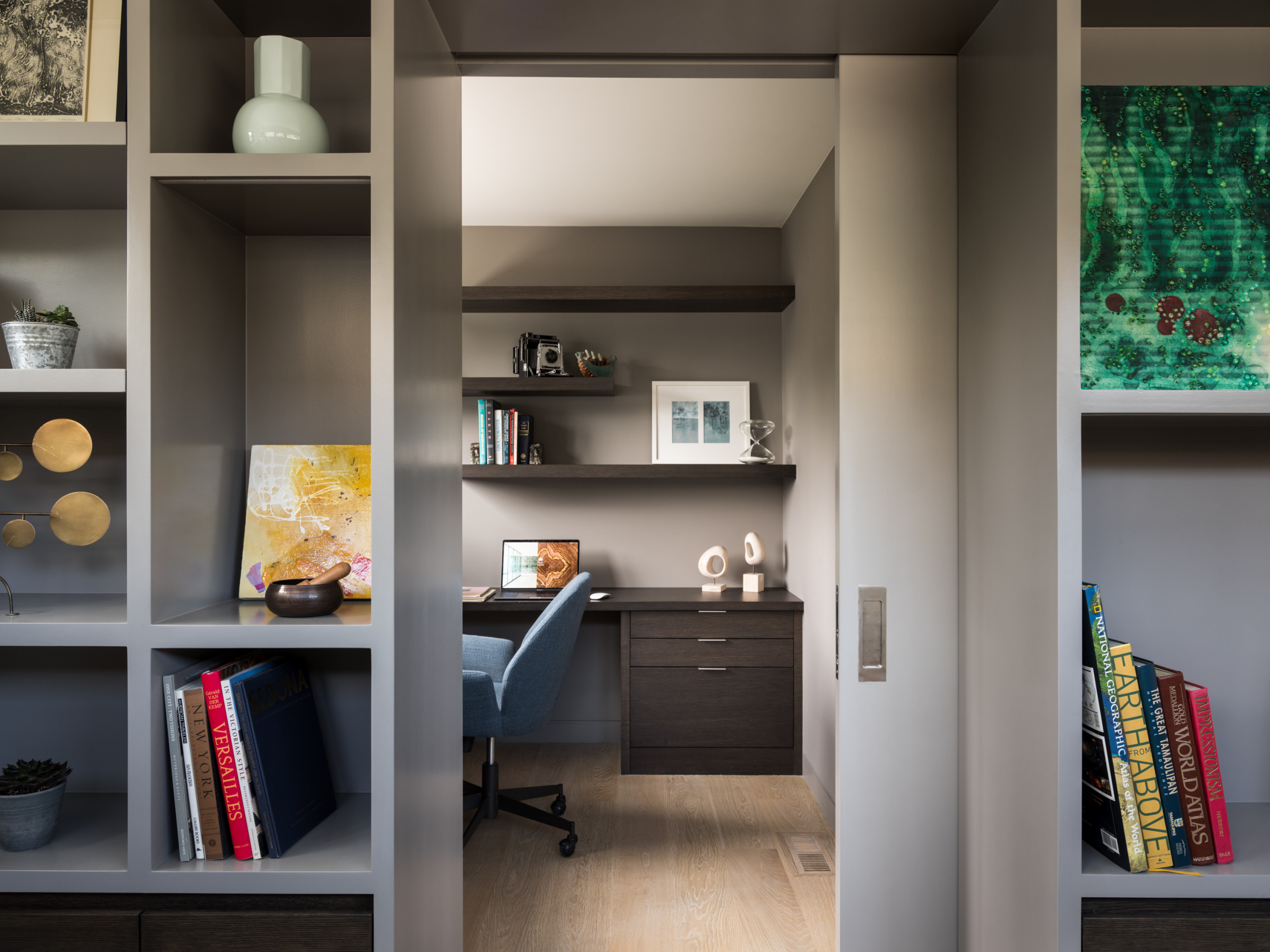 Often, a heavy, hinged section of cabinetry enables access to a secret room. However, in this clean-lined Colorado home by Cherie Goff of Cgmodern Architecture (completed while principal at HMH Architecture + Interiors), a hidden office space instead sits behind a simple pocket door built into a bookcase.