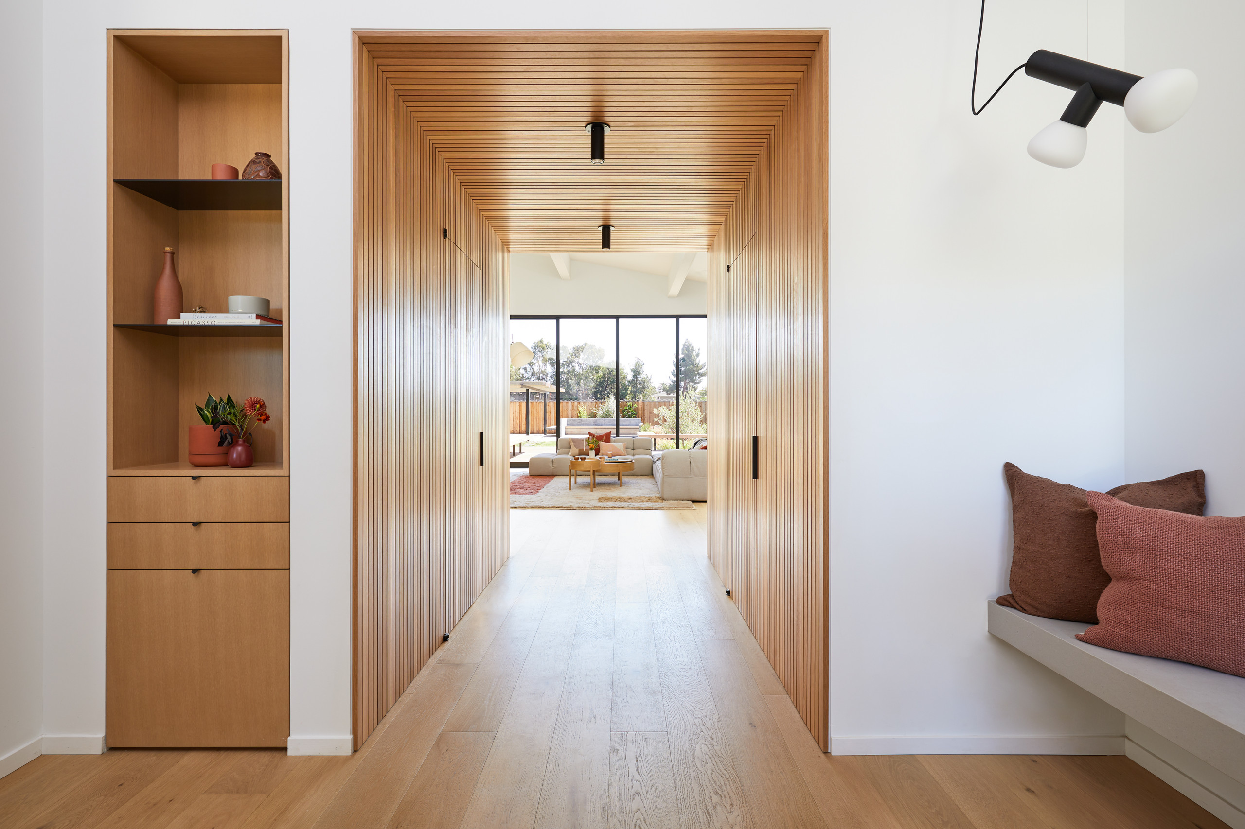 In an Australia-inspired home in Northern California, Cathie Hong Interiors camouflaged entrances to a powder room and coat closet with wood paneling.