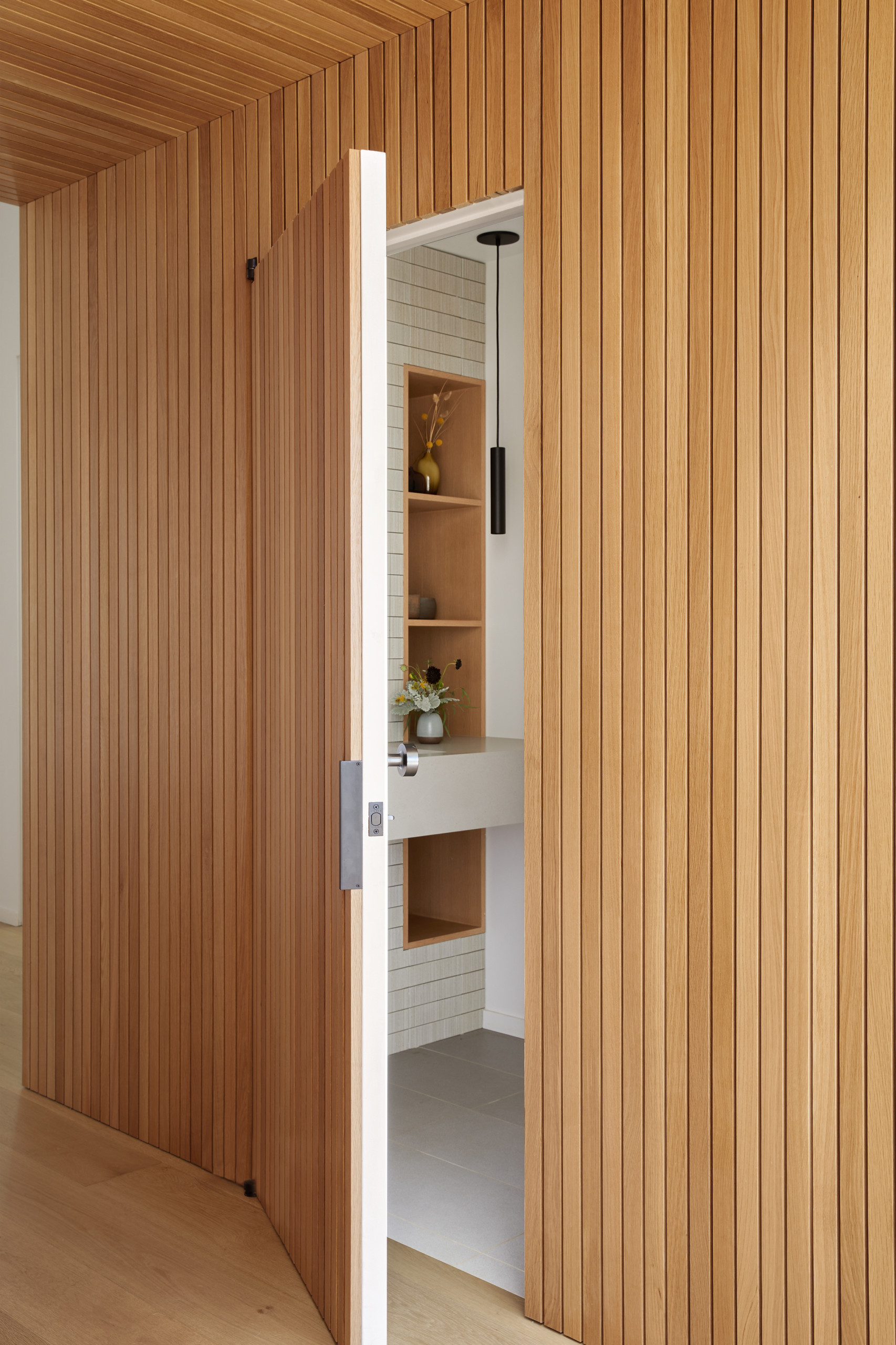 A door disappears into the vertical wood paneling of a Los Angeles stairwell by Karla Garcia Design Studio, disguising the entrance to an ultraprivate primary suite.