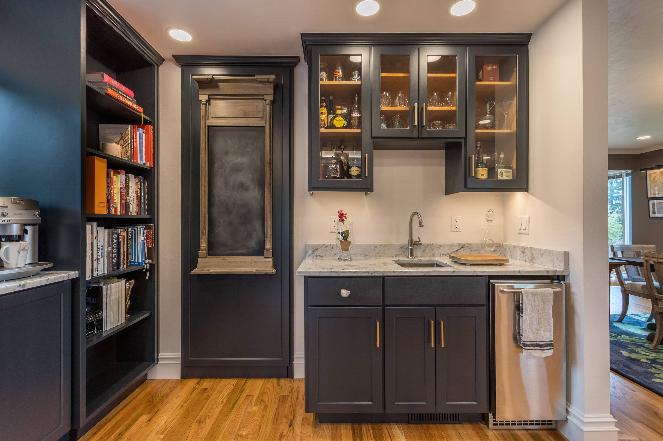 Check behind the cabinet door to the right of the refrigerator. Kimberlee Marie Interiors closed off the formal dining room and converted it into a hidden butler’s pantry with a drinks area.