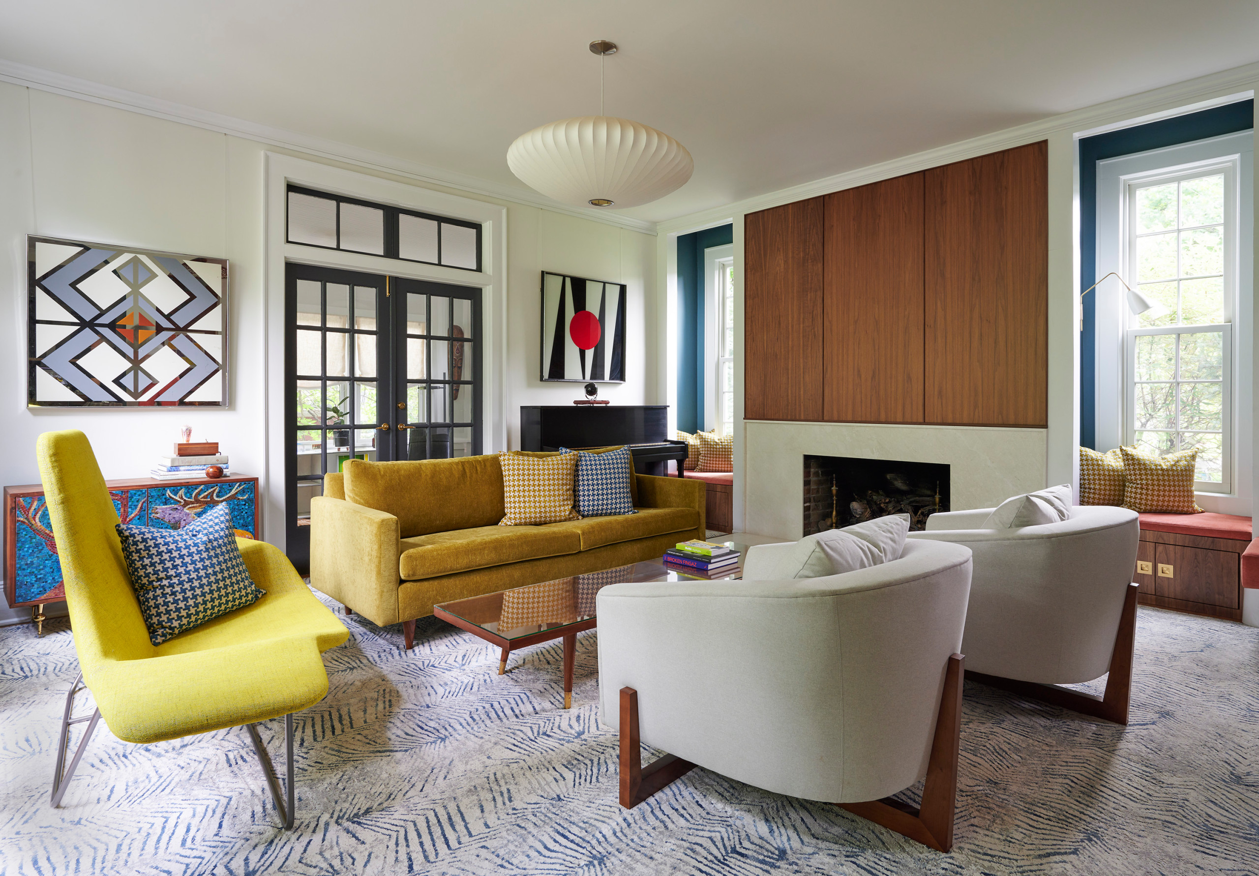 Walden Interiors brightened this New York midcentury-style living room with warm yellow accents. The muted golden tones add sunny warmth without overwhelming the space.
