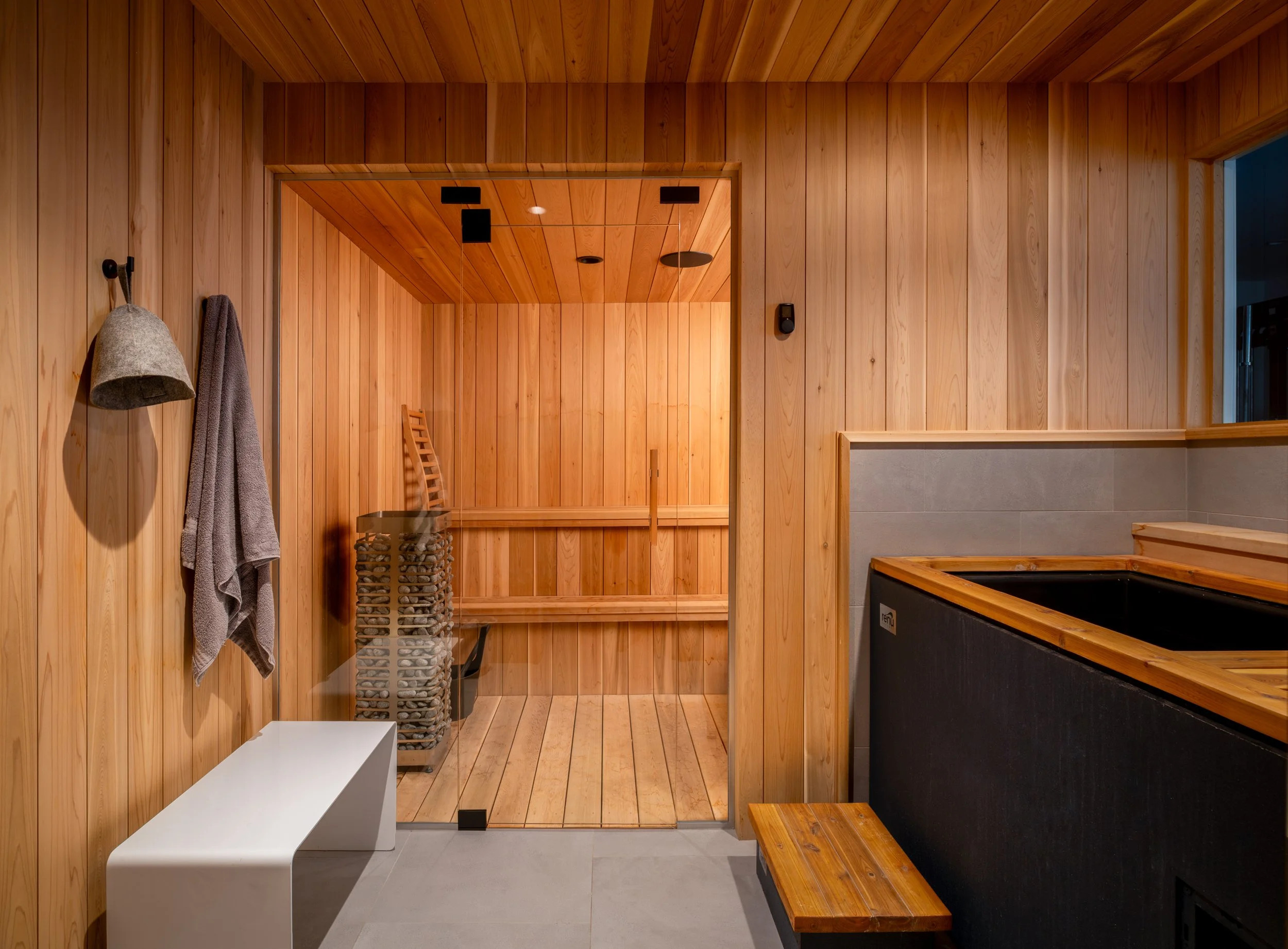 Strand Design outfitted this Minneapolis bathroom with an indoor sauna and cold plunge for a spa-like experience at home.