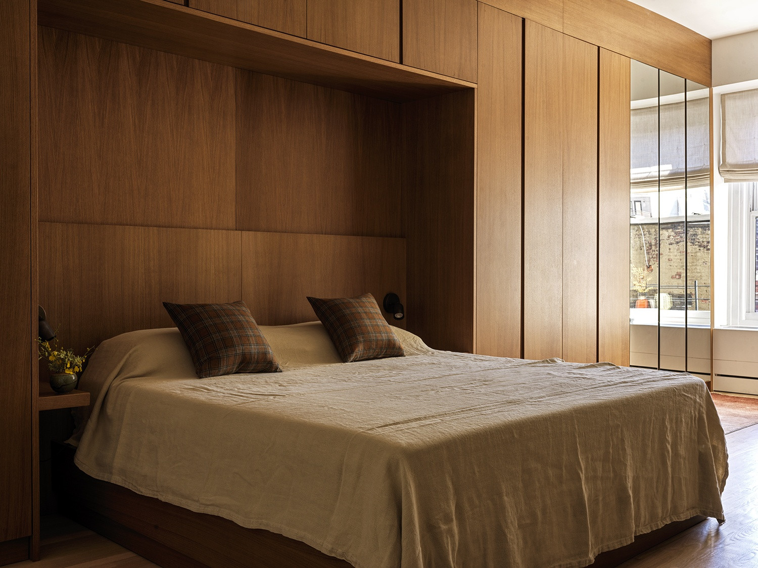 In this New York loft bedroom by architecture firm Plans, hardware-free storage units provide streamlined organization. The minimalist design maximizes functionality while keeping the space uncluttered and restful.