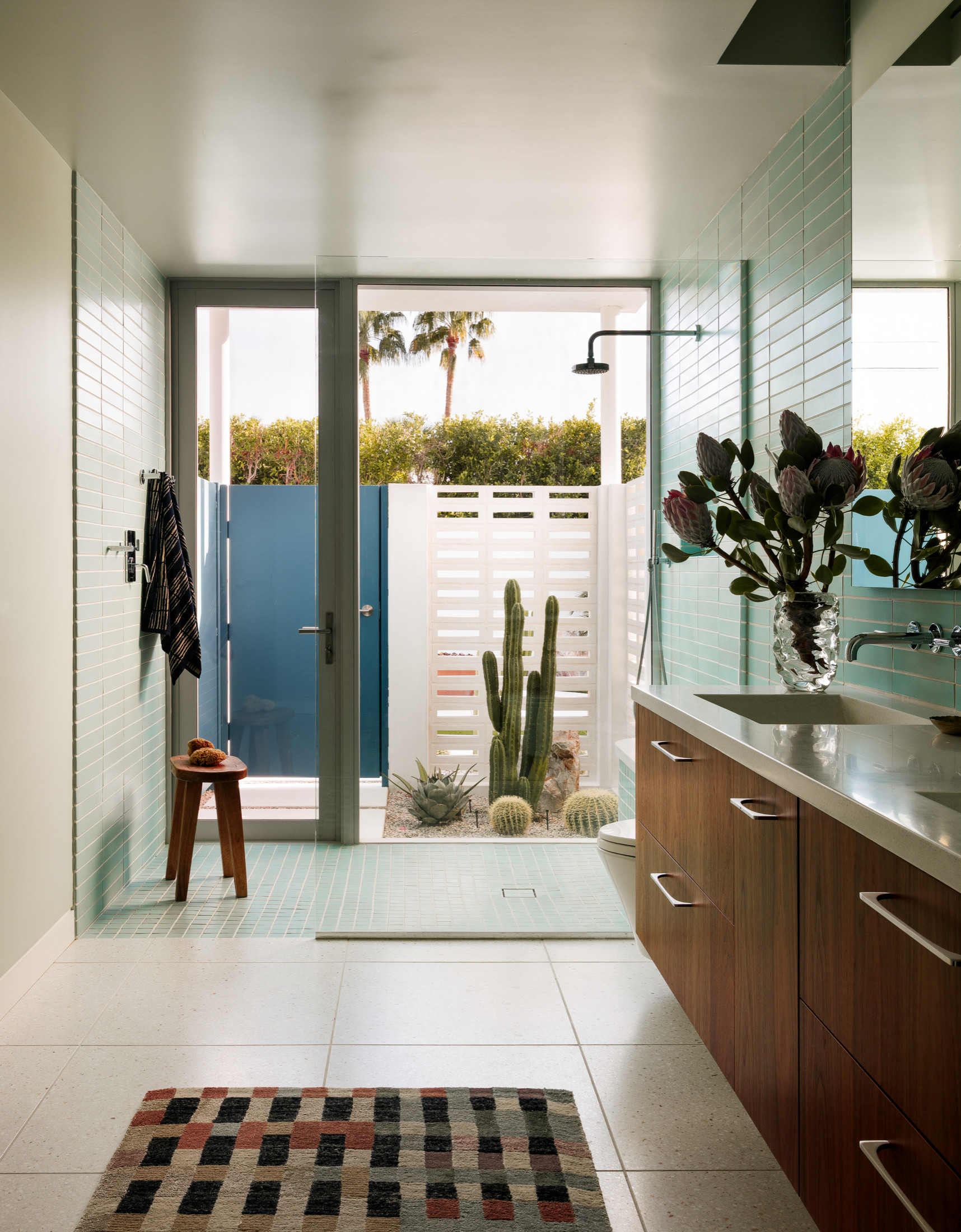 Guggenheim Architecture + Design Studio created a wellness-inspired bathroom in Palm Springs, California, with a curbless shower and seamless outdoor access.