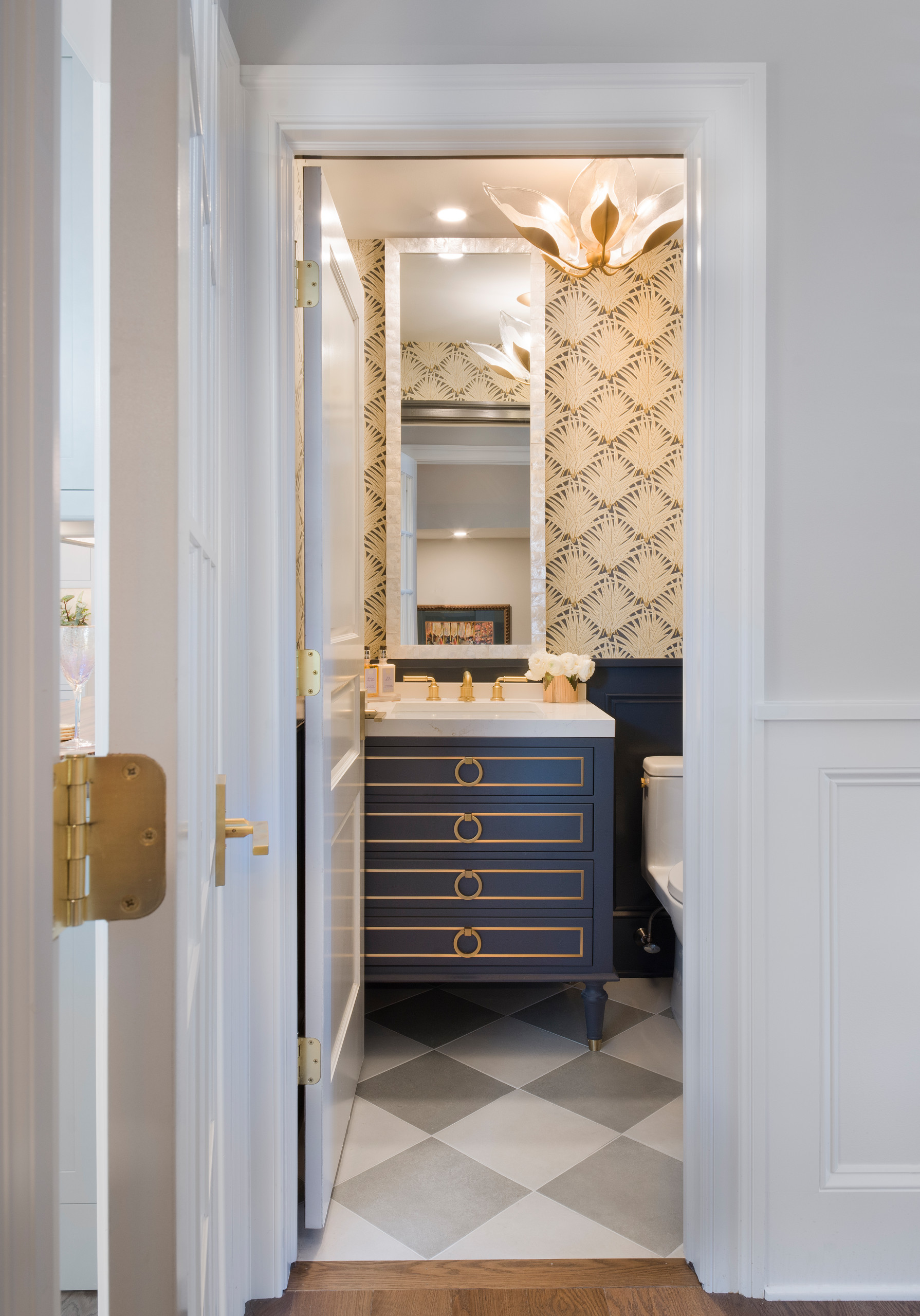 This Philadelphia powder room by Designs by Danica highlights Art Deco flair with sunburst-pattern wallpaper, ornamental lighting and circular vanity pulls.