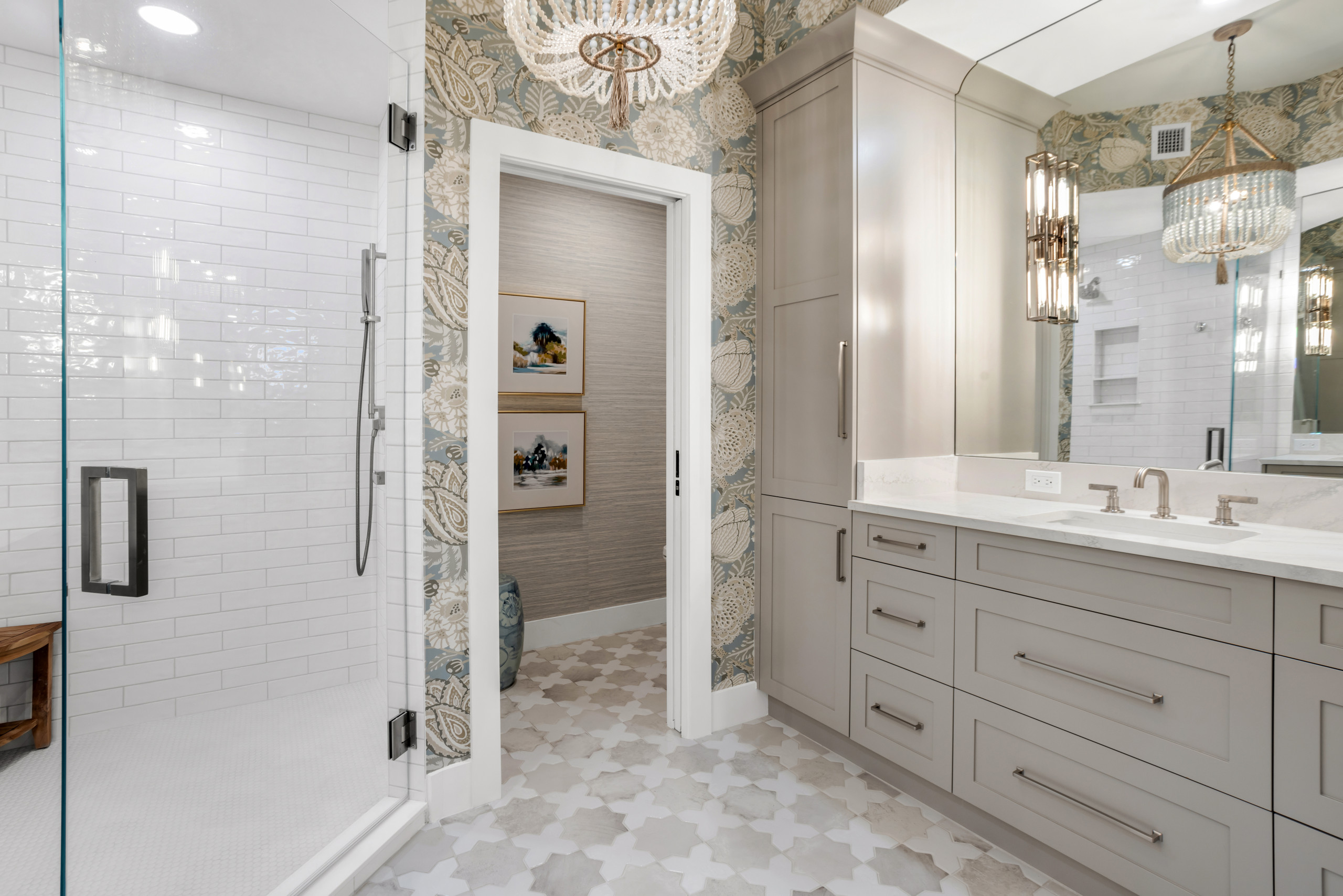 Star-and-cross tile flooring brings rhythm and elegance to this West Palm Beach, Florida, bathroom by The Place for Kitchens and Baths.