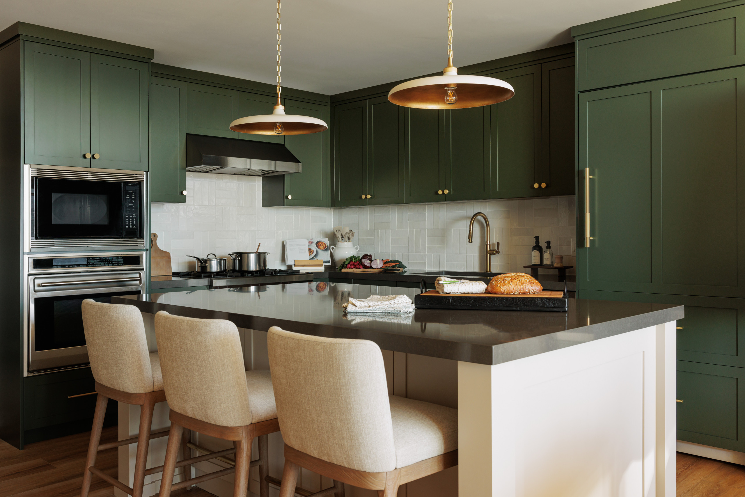 This Bellevue, Washington, kitchen by Eastside Kitchen & Bath shows how green can function as a neutral. Deep green cabinetry pairs with a creamy tile backsplash and island base for an effortlessly earthy look.