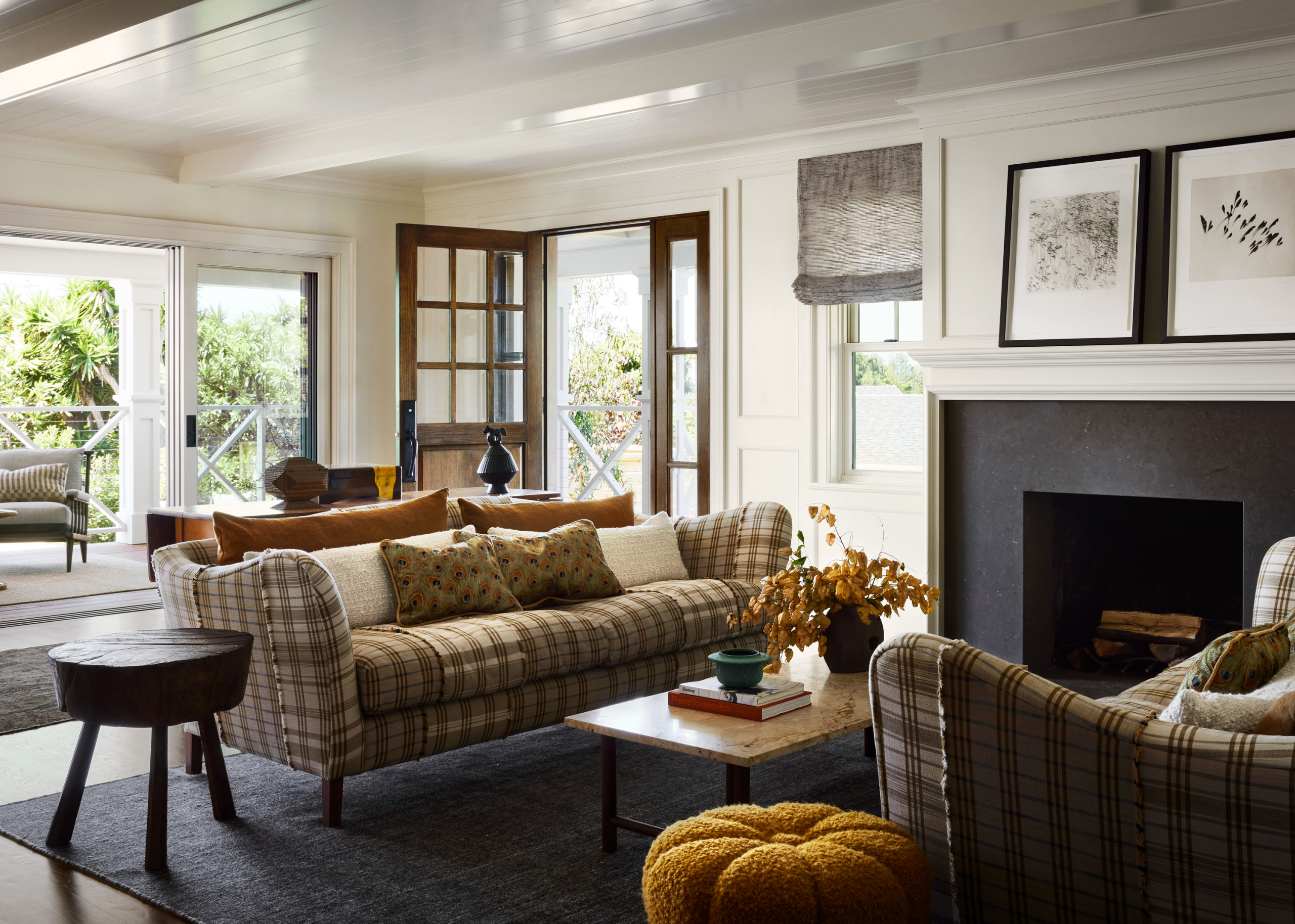 Grid-patterned sofas bring vintage charm and visual rhythm to this Orange County, California, living room by Lisa Berman Design.