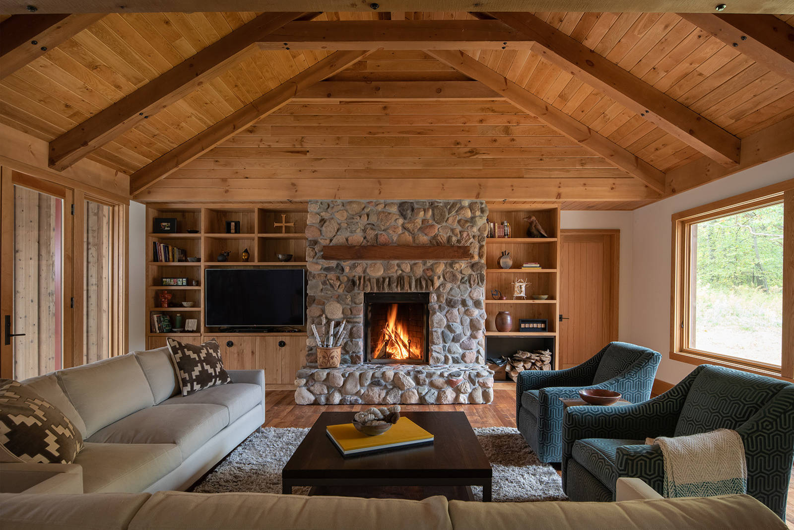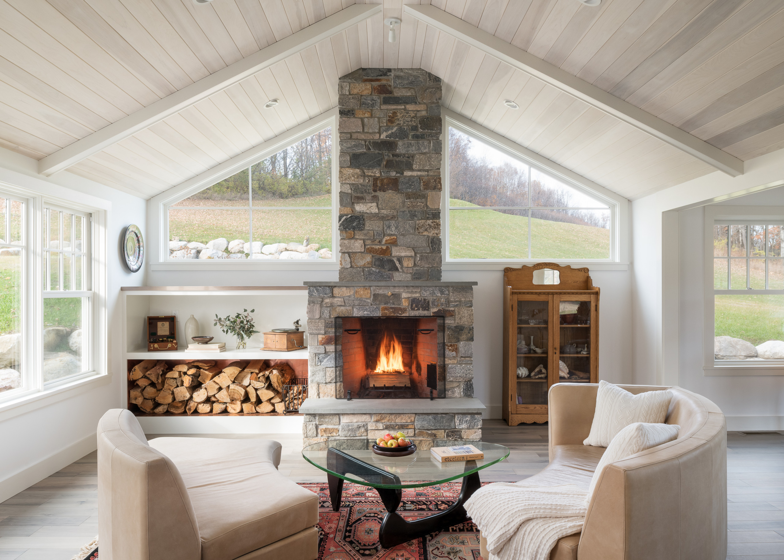 6. This Vermont home by Peregrine Design Build benefits from the interplay of rough-hewn and clean-lined, light and dark, antique and modern. Its stone fireplace pulls in the warm gray and brown tones in the rest of the room and outside the windows.