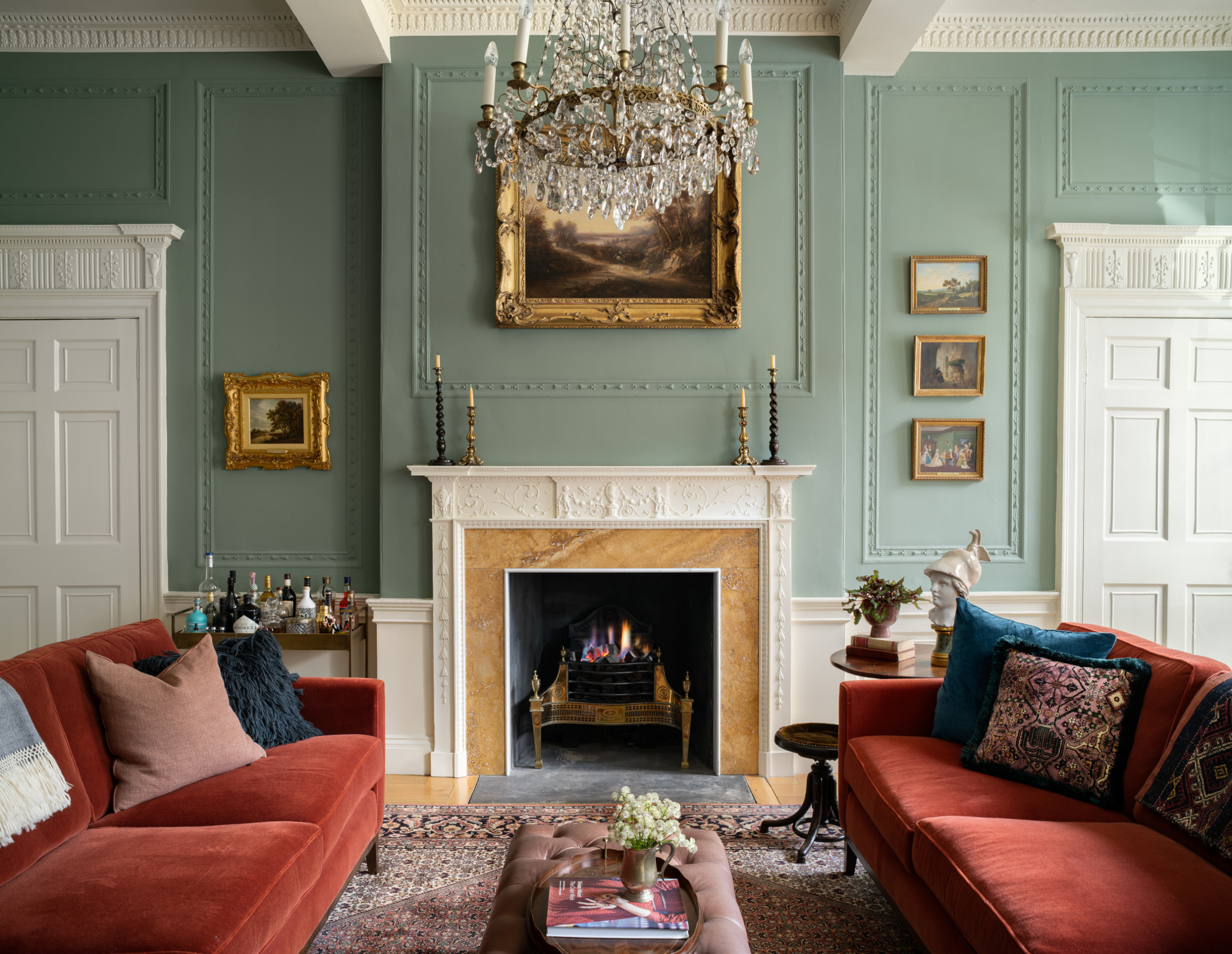 21. A cast-iron-and-brass coal grate glows in this formal Edinburgh, Scotland, living room. Its ornate metalwork echoes the golden picture frames as well as the intricate details on the formal surround and the room’s molding.