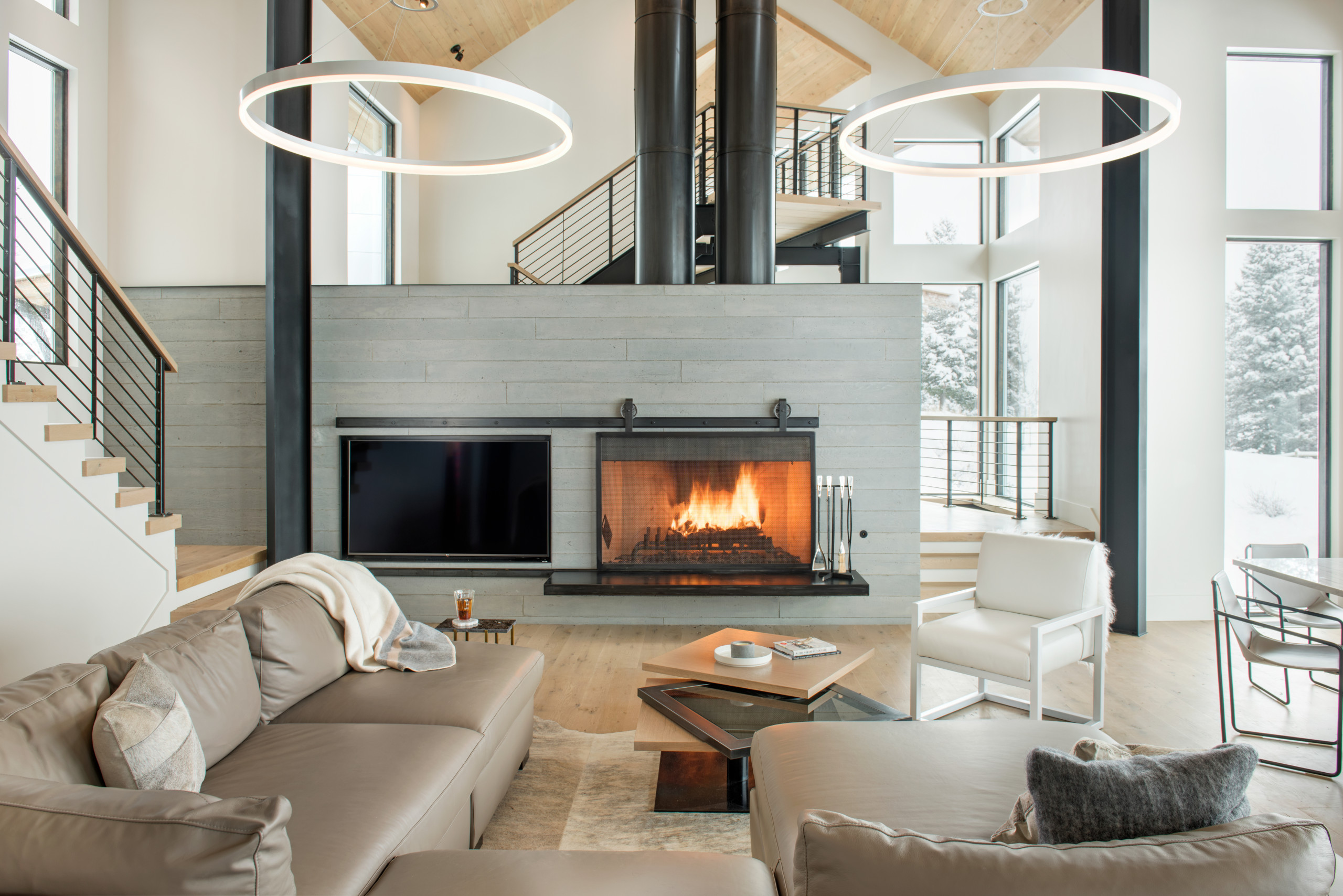 14. In a Big Sky, Montana, retreat by The Varda Group, the clever concrete-and-steel fireplace design incorporates a barn-door-style screen, a television and, tucked into the side, a built-in log holder.