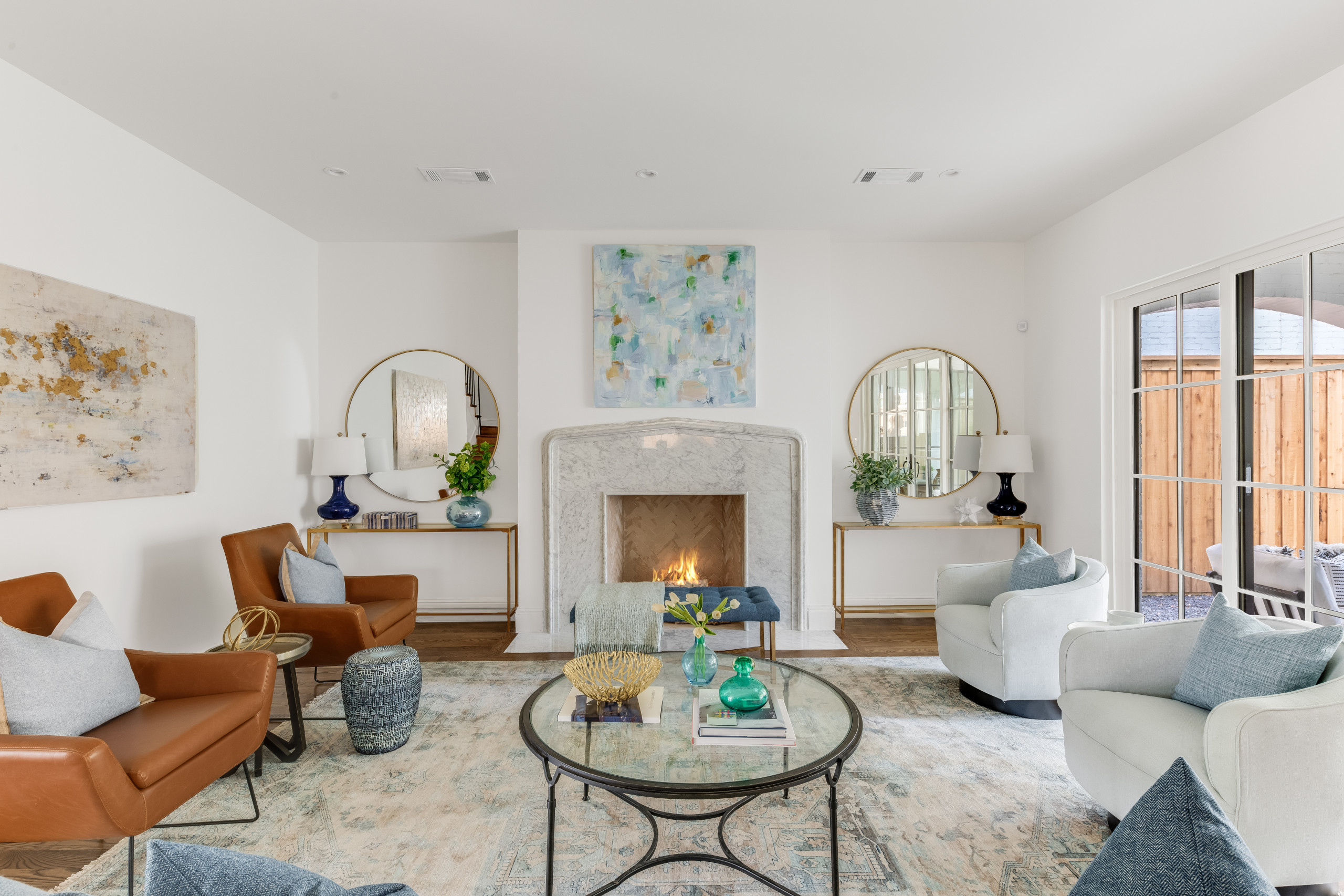 10. Twin mirrors and consoles flank the fireplace in this Dallas residence by Haynsworth Custom Homes. The stone surround and herringbone-patterned firebox imbue the transitional-style room with elegance.