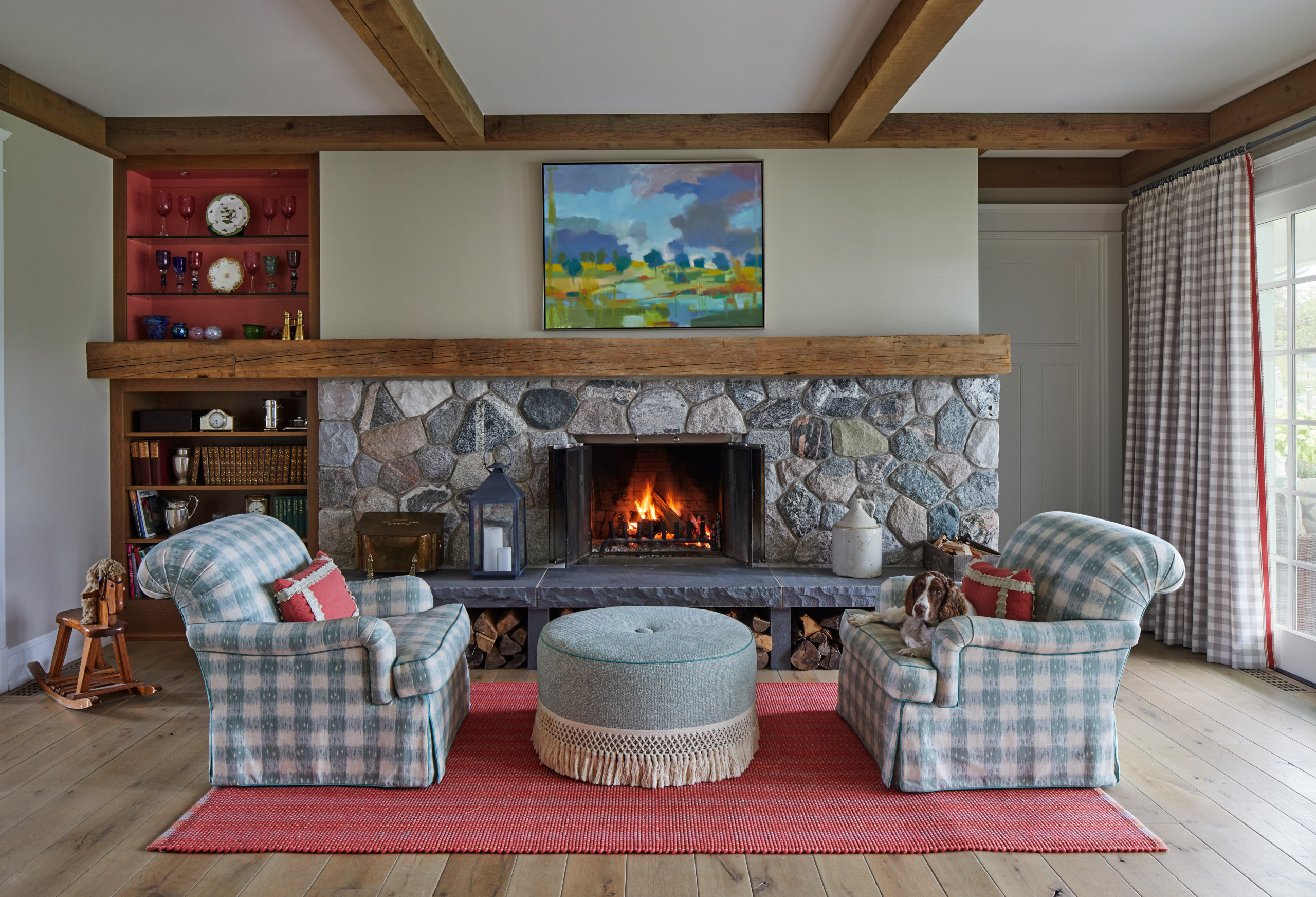 23. A big, boulder-y fireplace of over-grouted stone is the focal point of the living room in this Minnesota farmhouse by Rehkamp Larson Architects. A contrasting stone header and rough-hewn wood mantel add to the handmade, rustic charm.