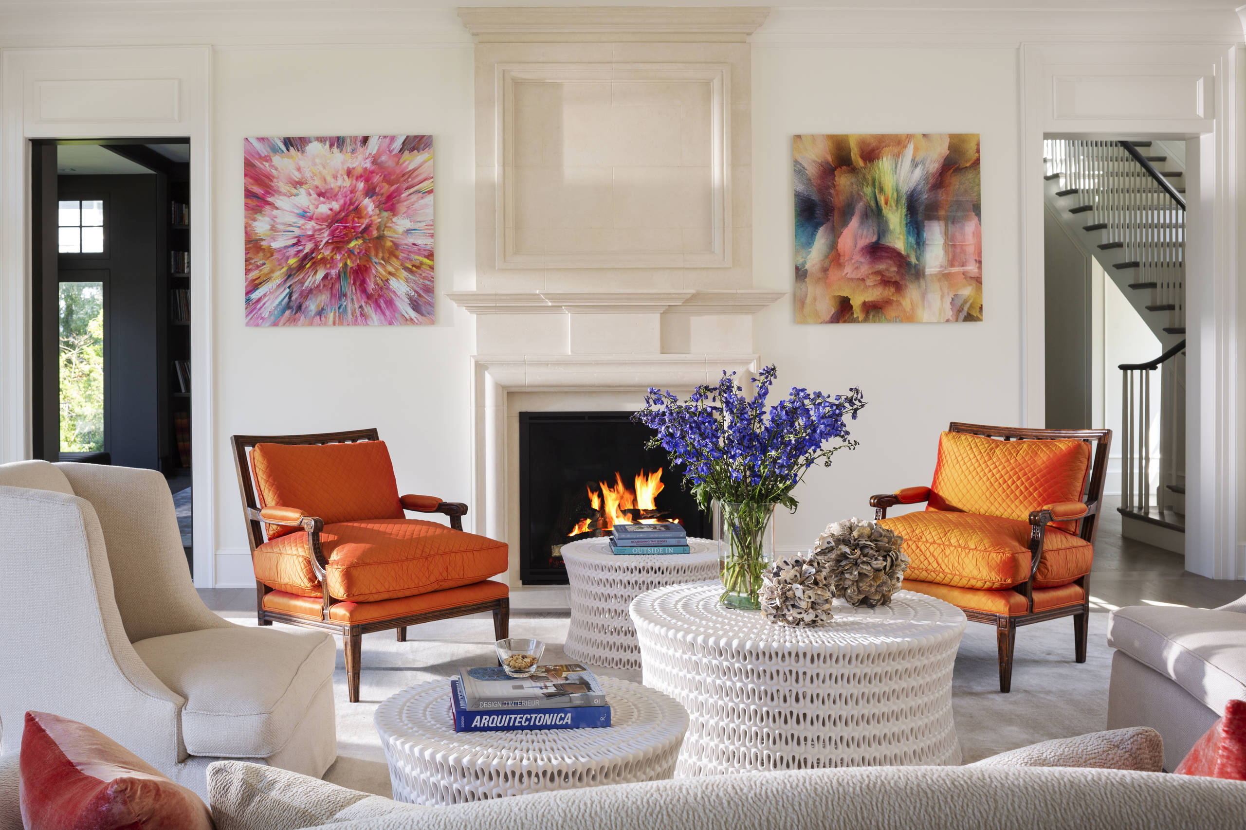 24. In a grand Shingle-style residence overlooking New York’s Long Island Sound and built by Stokkers & Co., a peppy palette, copious sunlight and a cozy fire make for an inviting coastal-style living room.