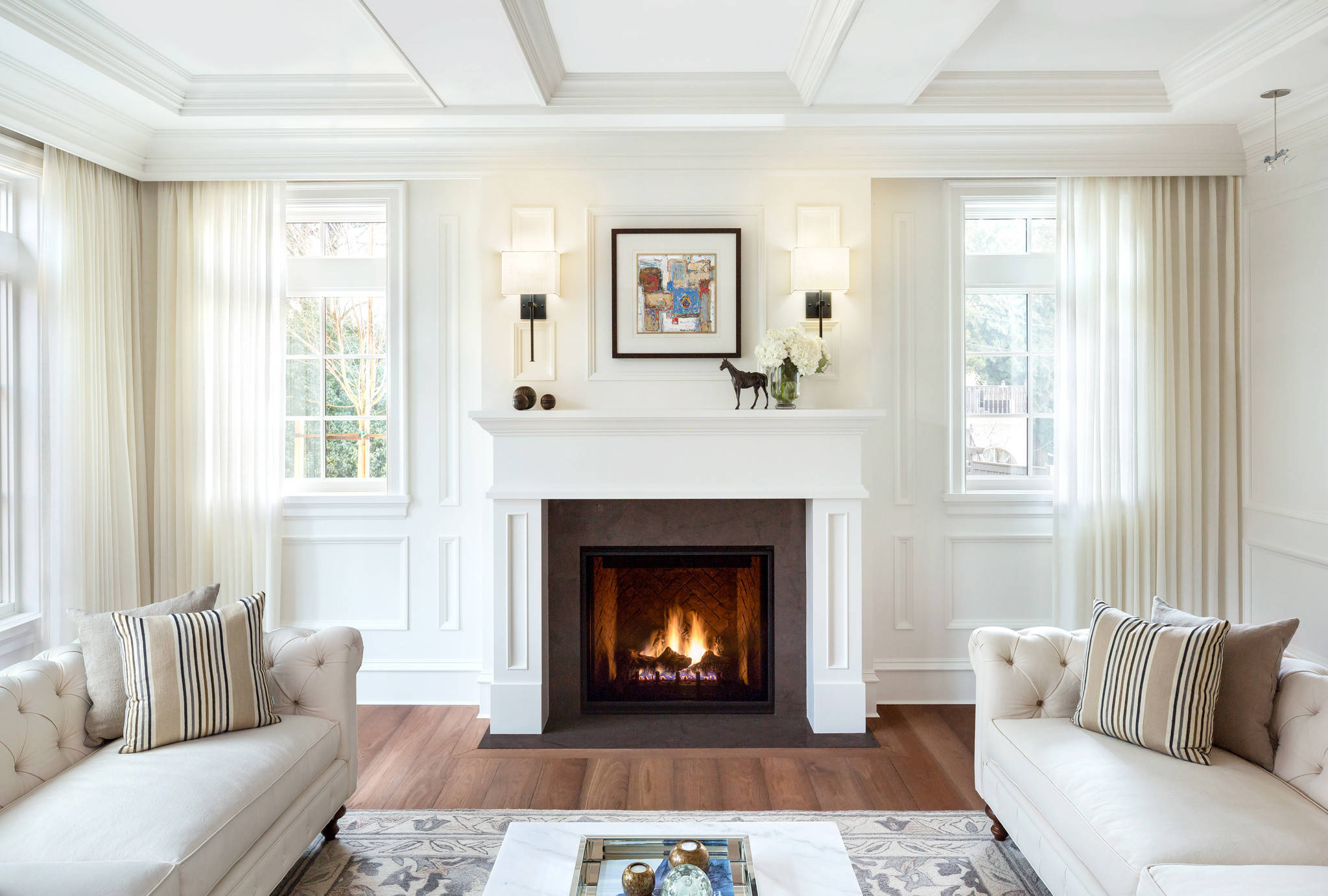 19. Another Vancouver project, this one by Peter Rose Architecture + Interiors, is replete with decorative millwork painted in crisp white, including the classical fireplace mantel. The deep brown stone surround and hearth and herringbone brick firebox stand in stark contrast to the light neutral backdrop.