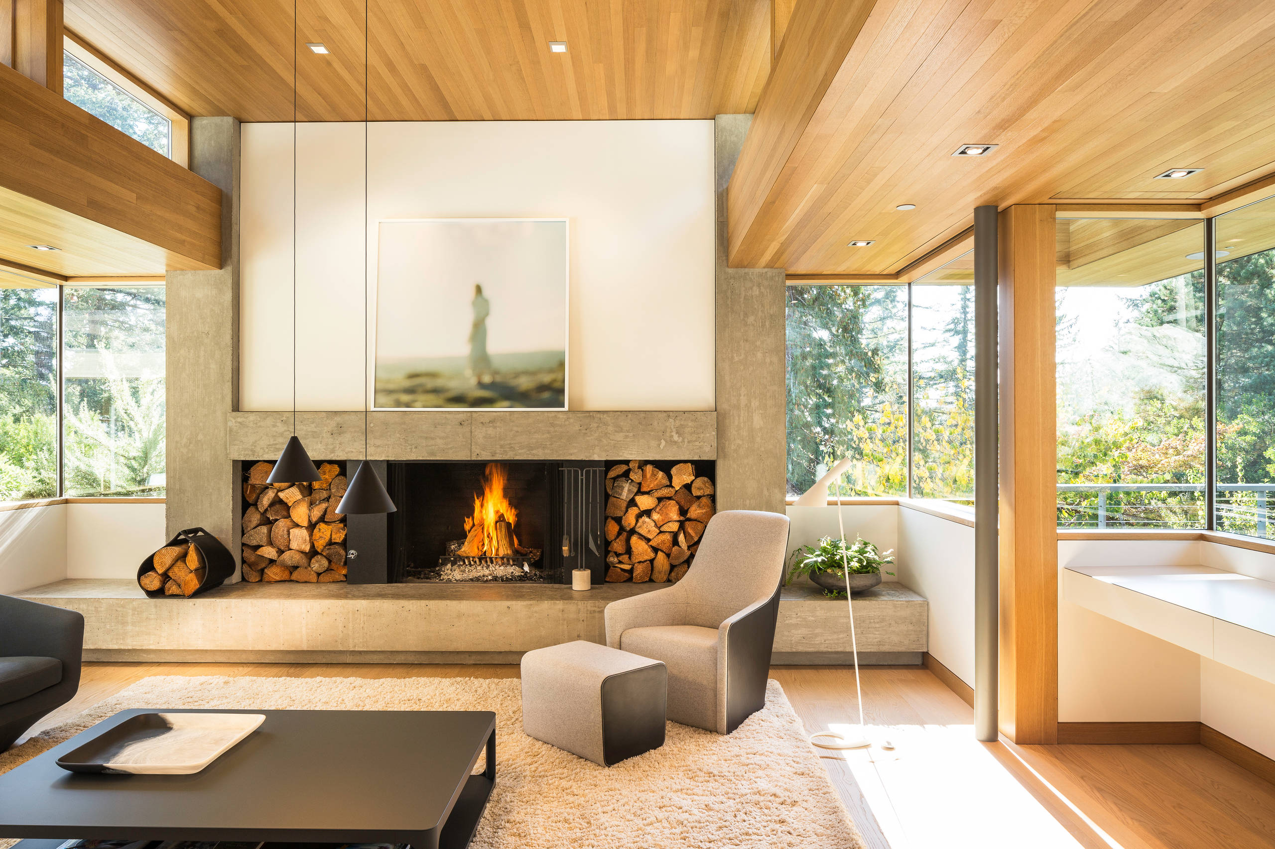 4. On the south end of Washington’s Bainbridge Island, this home by Dana Webber Design Group has a wood-burning fireplace with a concrete surround, whose wood-grain look creates an earthy-modern backdrop for the natural wood mantel.