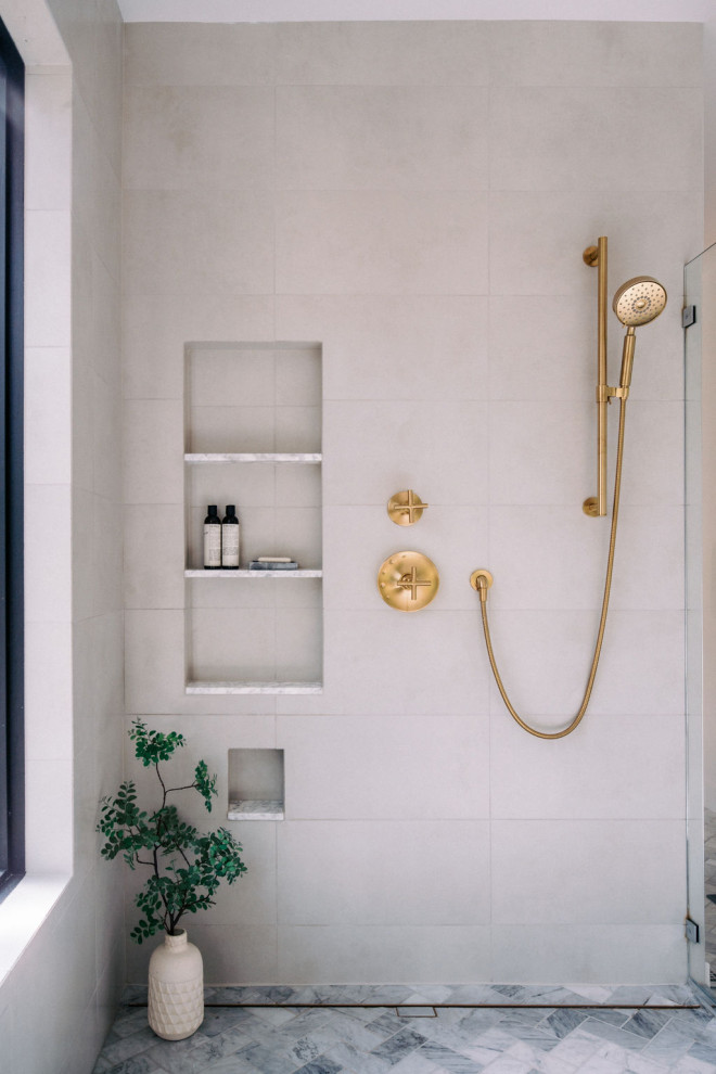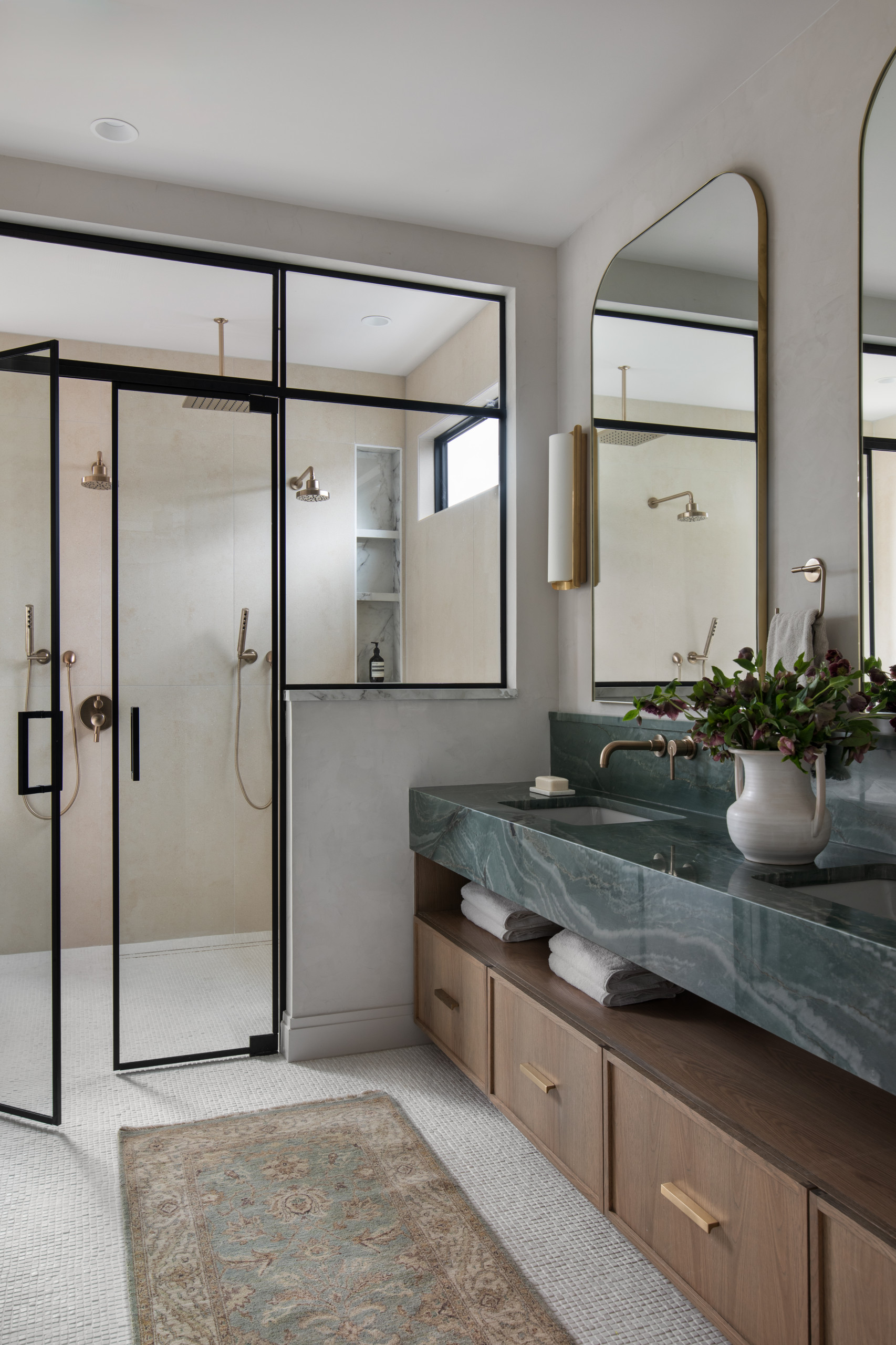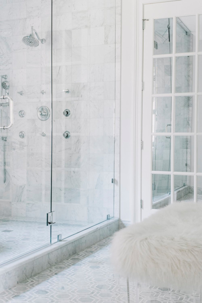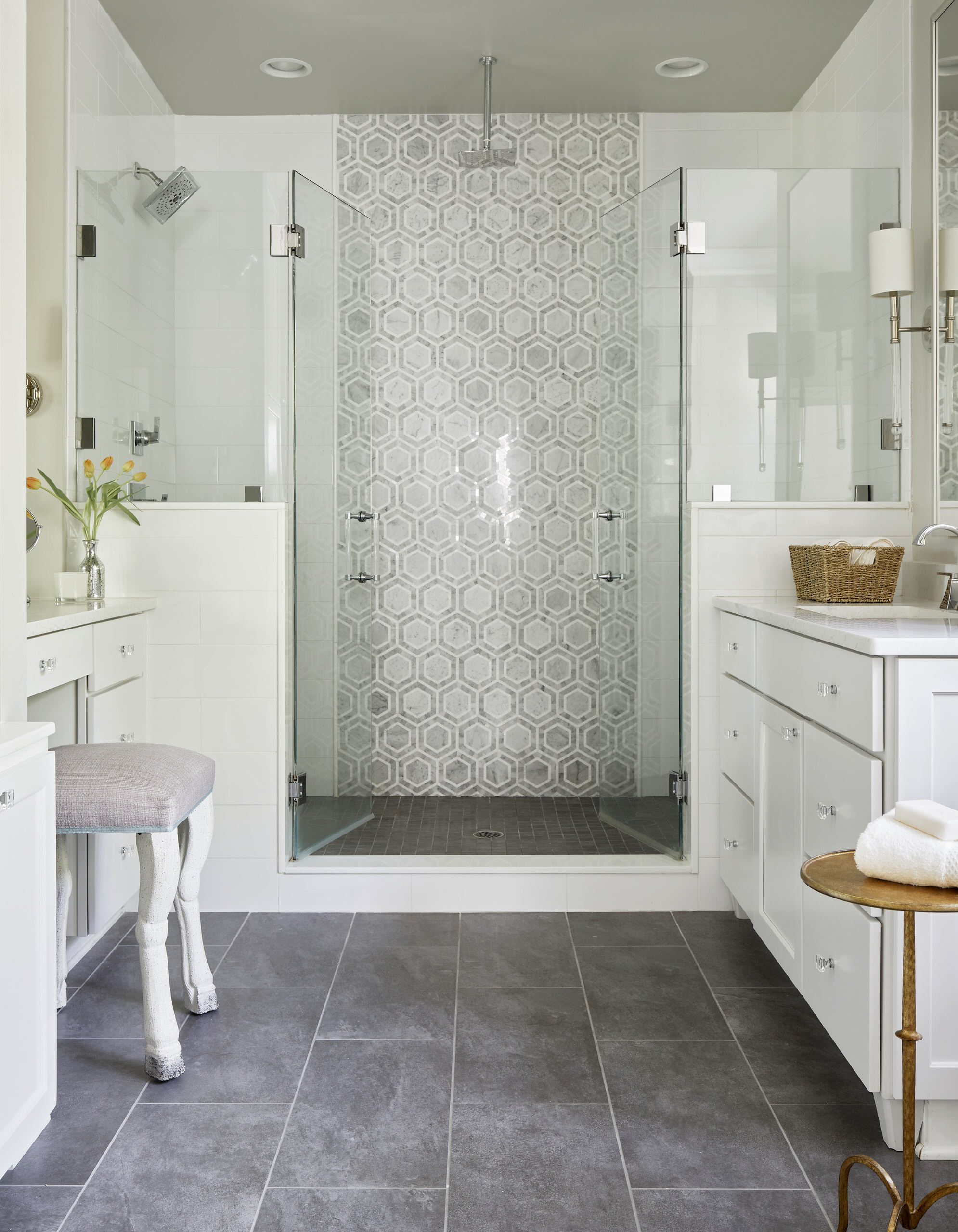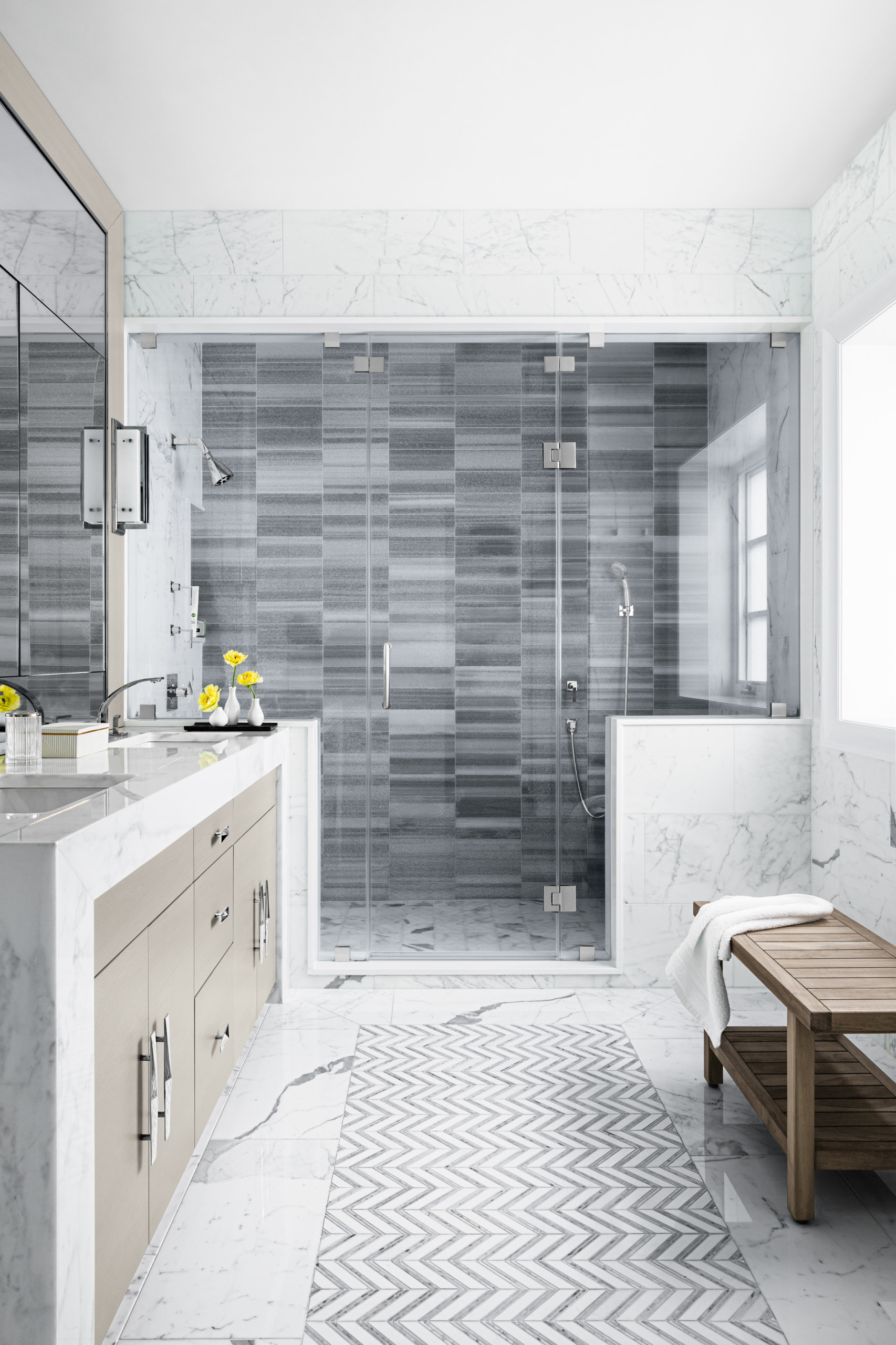 In this primary en suite in a newly built home in Richmond, Virginia, Hillery added a band of patterned marble tile to the wall of the symmetrical shower to create a focal point as well as clear spatial divisions.