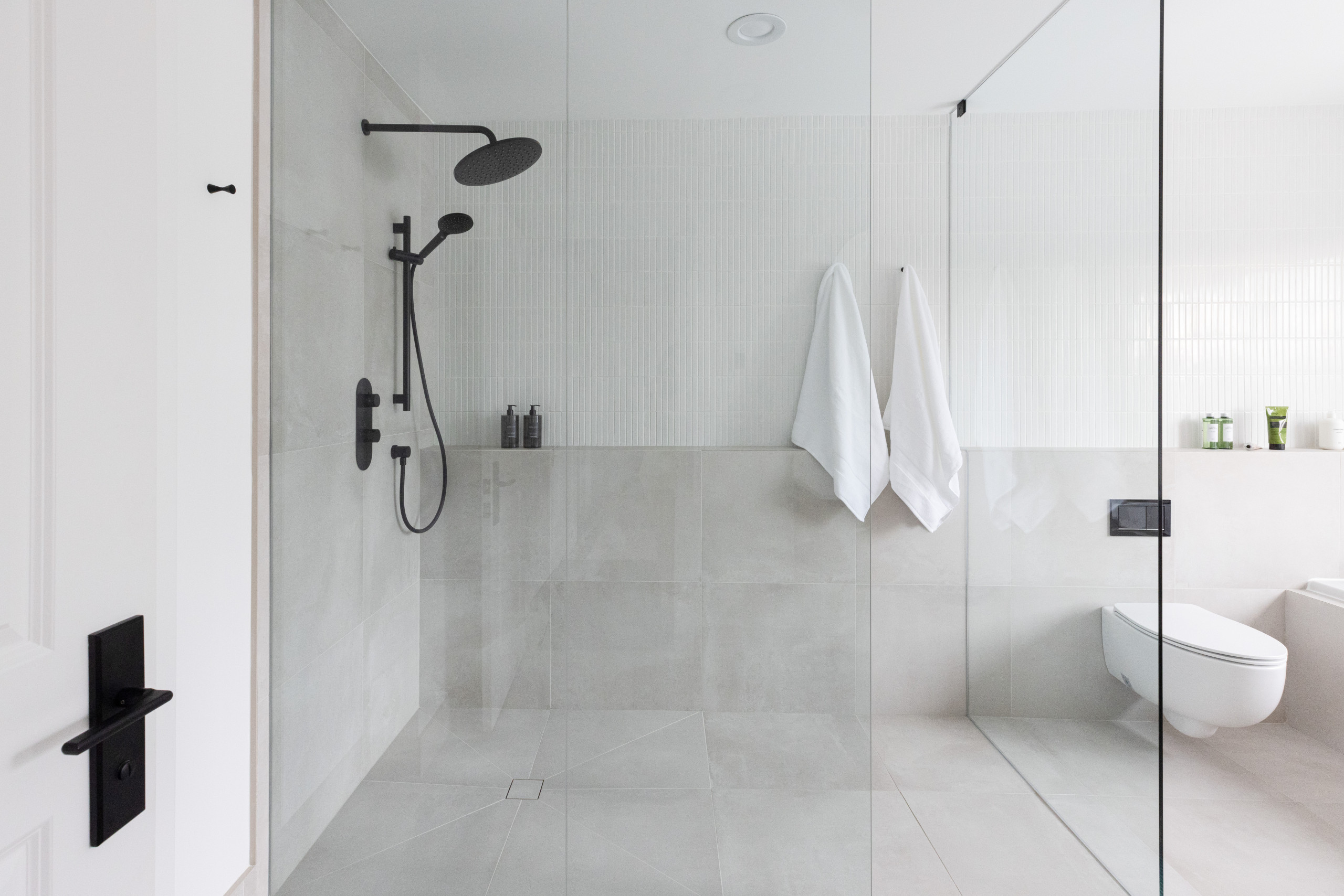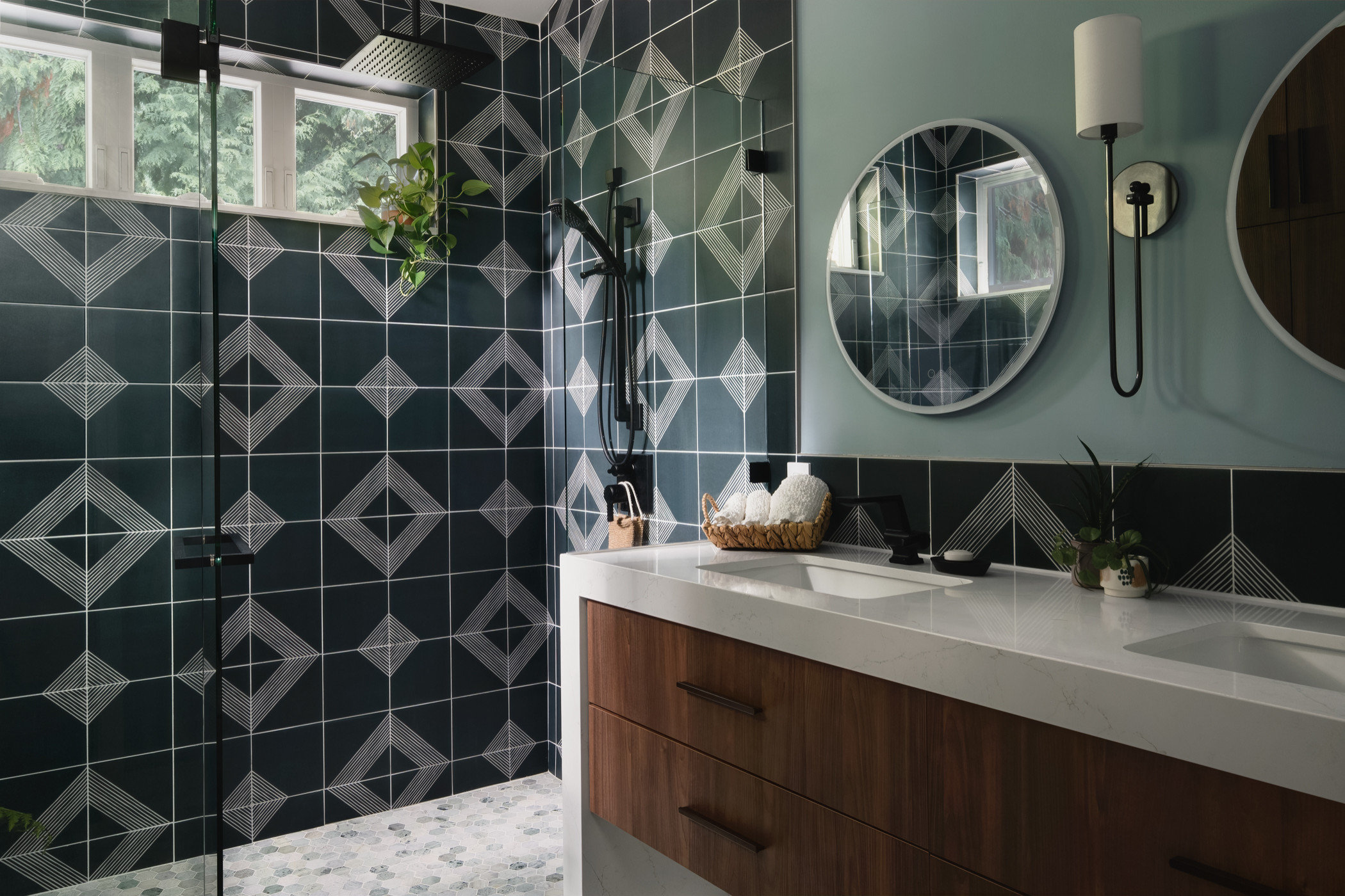 18. Feature tile. “If a client wants to make a statement, we recommend creating a contrast tile backdrop centered on the glass door,” Hillery says. “Opting for a glass wall or door will showcase the beautiful tilework and create the illusion of more space.”
