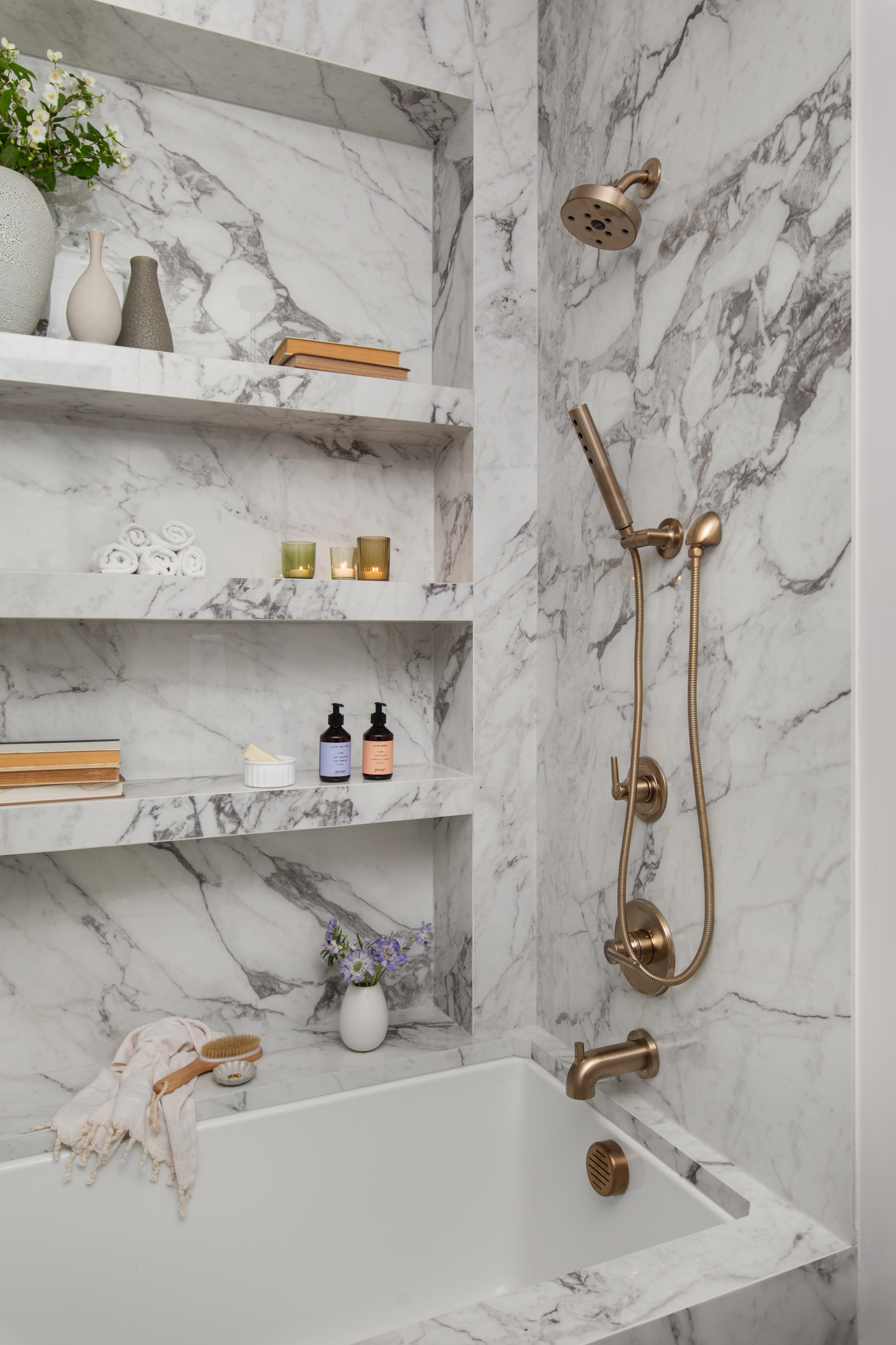 “When it comes to a nook [or niche], my advice to clients is always: Go bigger and deeper than your contractor recommends,” Palicki says. “Most people have oversize shampoo bottles, soap, razors, kids’ products and more. You will need the depth and not the hassle of figuring out which little nook can hold what and then find yourself running out of room in your brand-new space.”