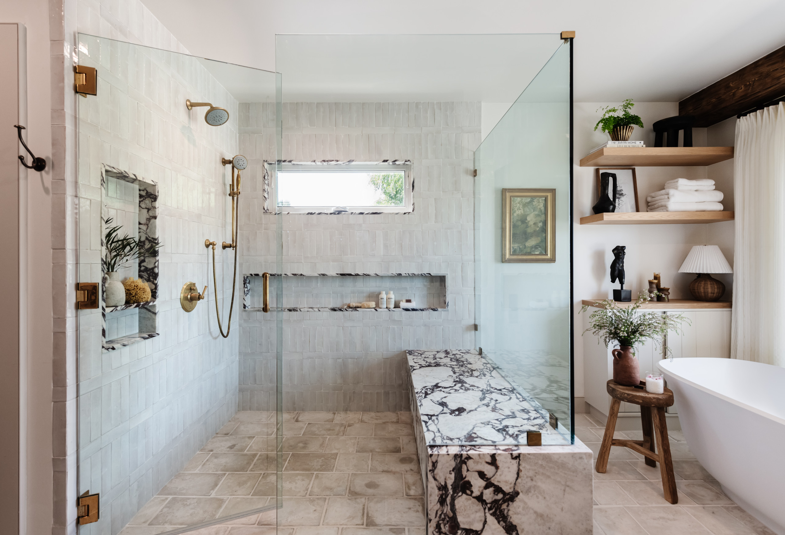 9. Bench. “We always recommend a built-in shower bench that doubles as storage and seating. It’s a win-win in our book,” Hillery says.