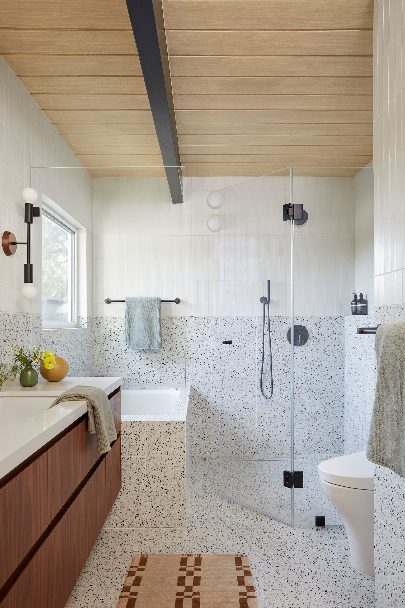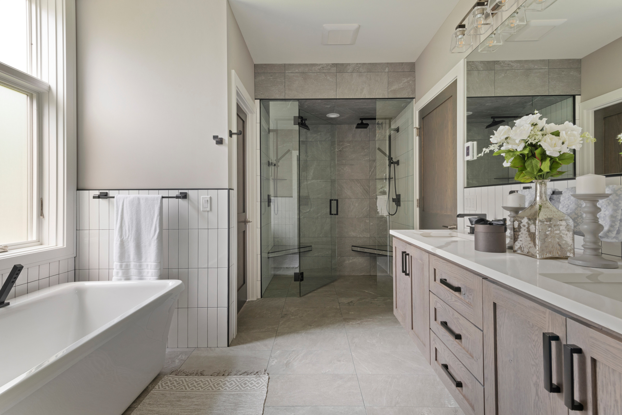 “If the shower is on an exterior wall, I love incorporating a clerestory window — it brings in natural light while maintaining privacy,” McCarthy says. “To complement it and ensure the space is well lit, add one or two overhead lights.”