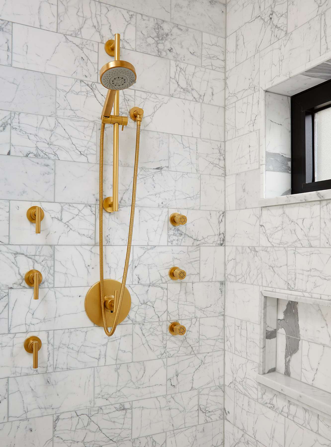 Soto is also a fan. “This bold choice adds a striking contrast and a touch of elegance to any shower,” she says. “I typically pair matte black fixtures with stone tiles in a neutral, like warm beige, light slate gray or Calacatta Gold.”