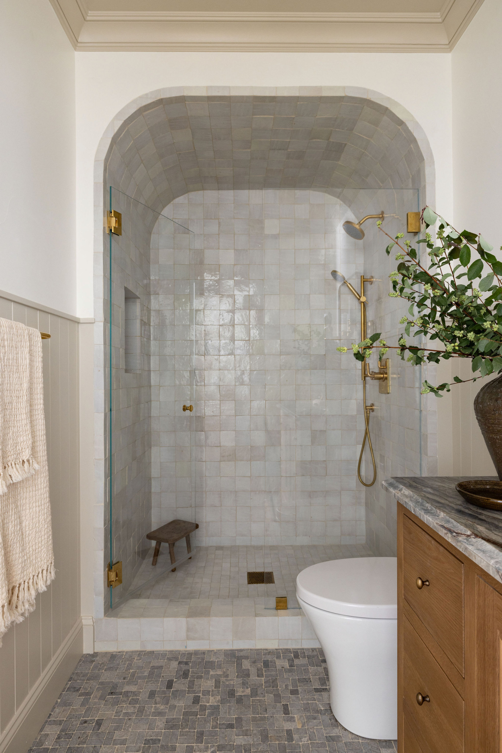 “A few of our shower go-tos include beautiful tilework, a glass wall or door, a rain shower head — or two! — and a built-in bench,” Hillery says.