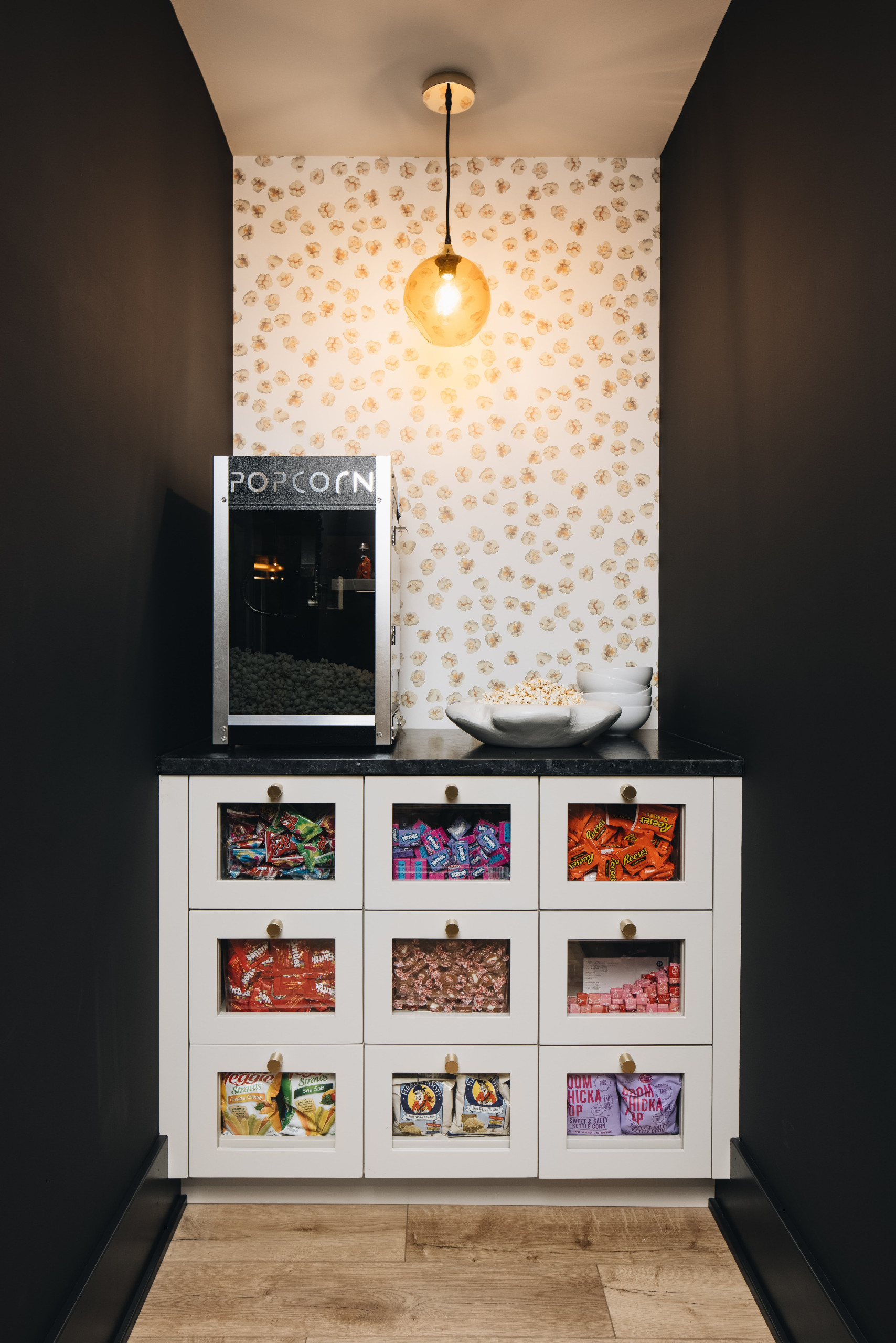 Don’t forget the popcorn! In this Illinois basement by Amy Storm that’s built for entertaining, a snack area complete with a popcorn machine re-creates the theater experience.