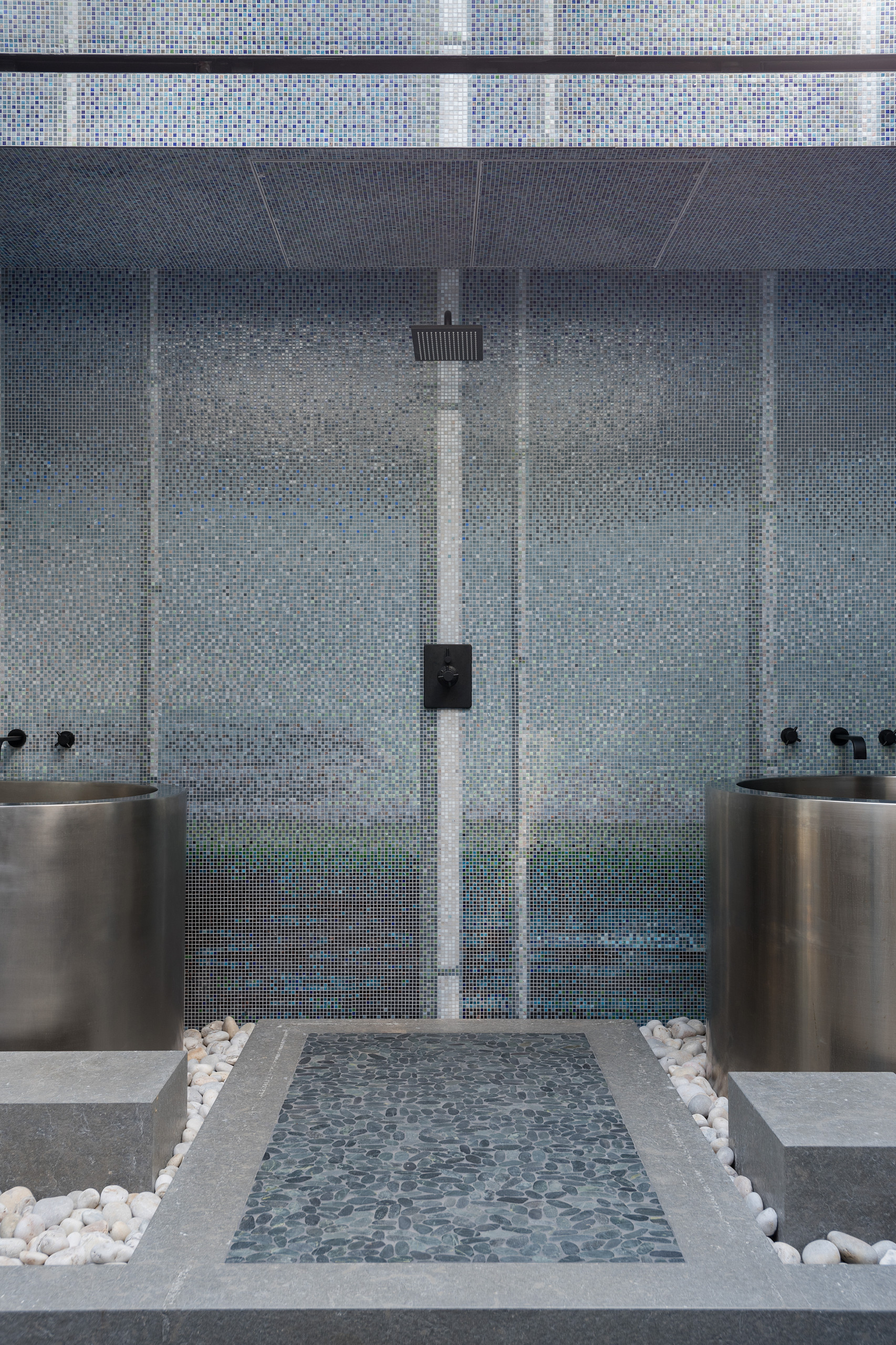 In Newport Beach, California, the basement of a lavish, modern waterfront home completed by Solanna Design & Development has a full spa that includes these hot and cold tubs surrounded by walls of shiny mosaic tile. A glass ceiling lets in light and separates the room from the courtyard above. Check out the spacious salt cave too.