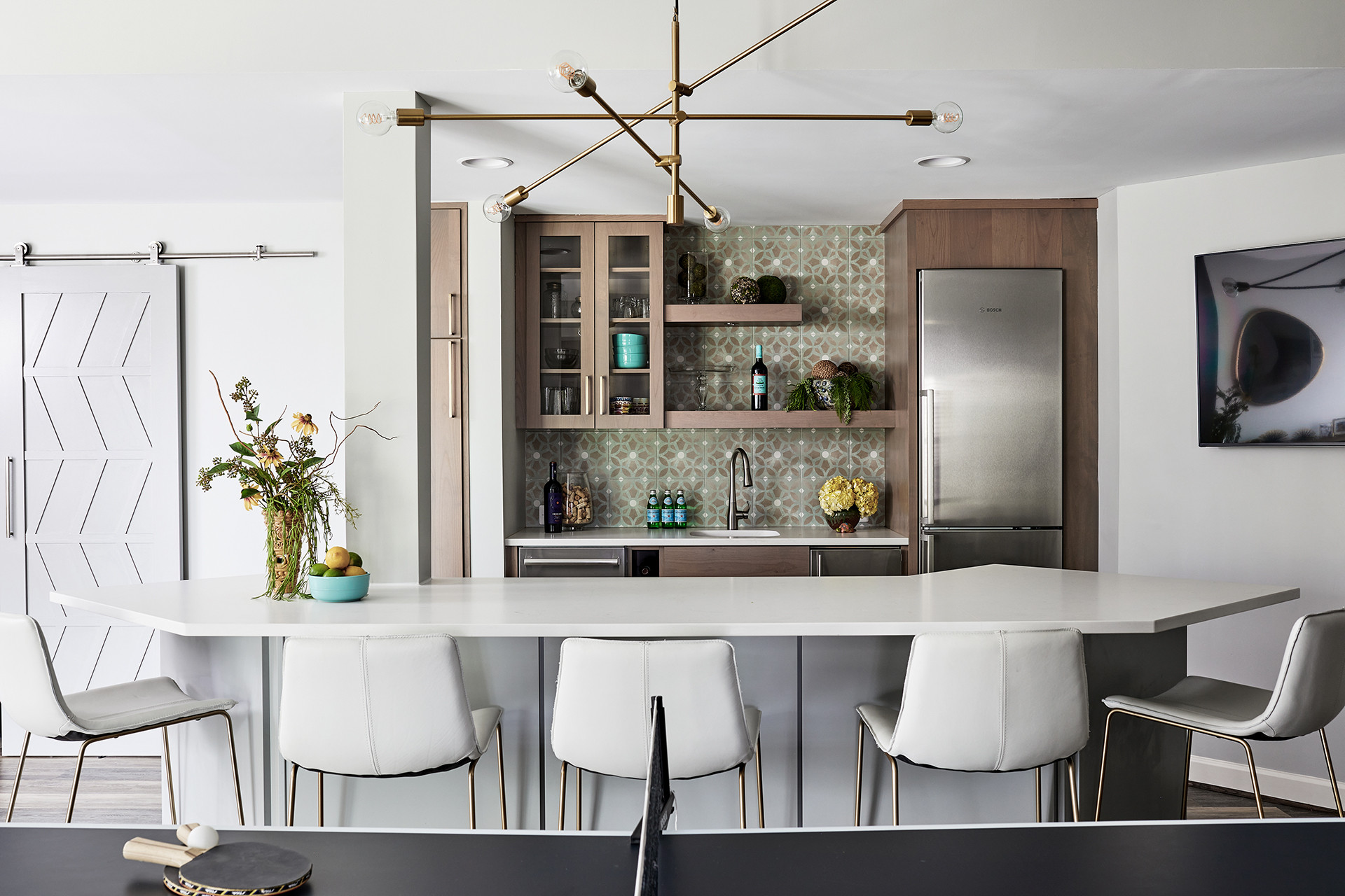 Raise your hand (or your glass) if you or your parents had a basement wet bar back in the ’70s, complete with wood paneling and shag carpeting. Well, that American classic is back in a big way, albeit with modern finishes — like those incorporated by Case Architects & Remodelers in this basement remodel in Herndon, Virginia.