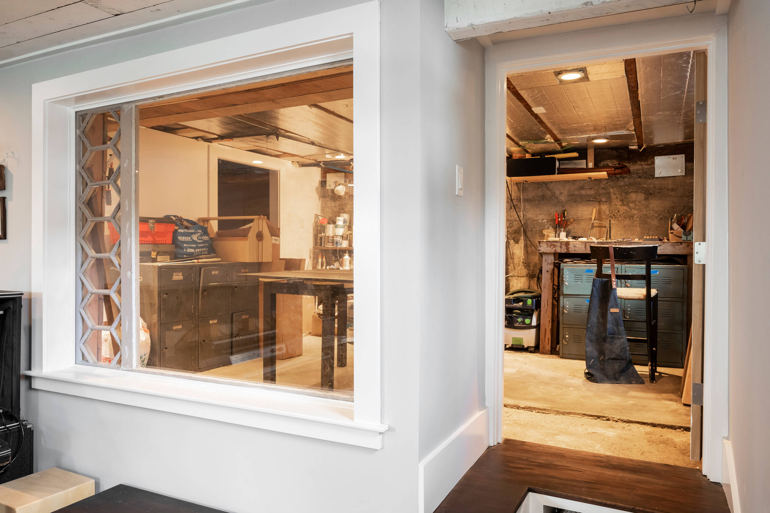 Pathway Design & Construction upgraded the basement of a Seattle couple’s carriage house with a hydronic heating system in the floor and two zones for their hobbies: a band practice area for him and, on the other side of the interior window, this less-polished woodworking shop for her.