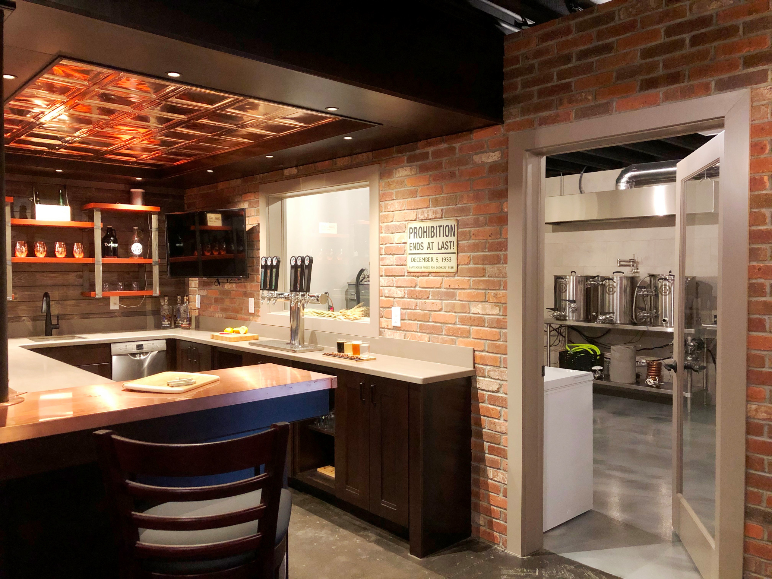 Rochman Design-Build converted the unfinished basement of a new Ann Arbor, Michigan, home into this home pub and commercial-grade craft brewing space, with a viewing window between them.