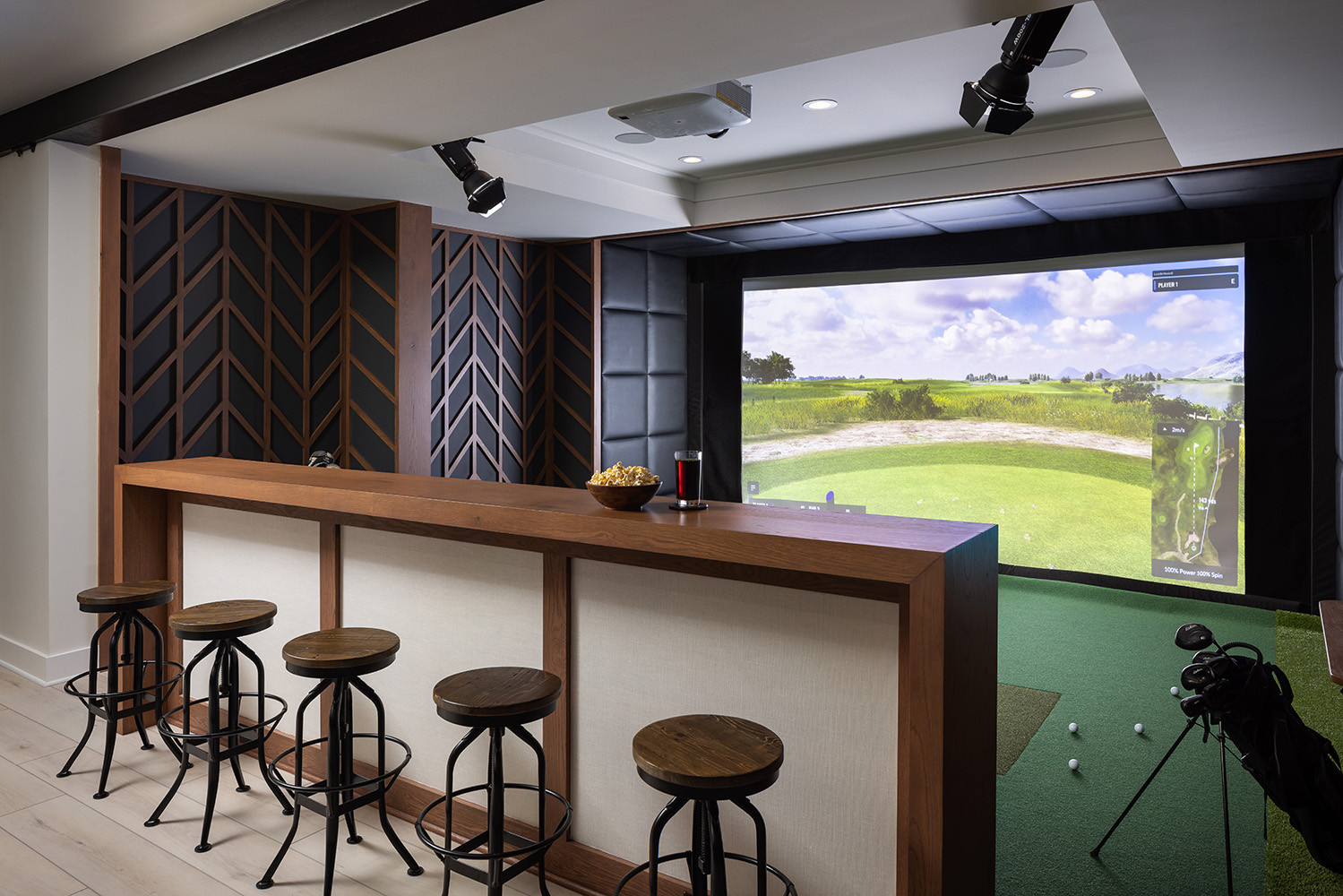 Searches on Houzz for “basement golf simulator” were up a whopping 1,905% year over year in 2023, according to Houzz search data. Long Island, New York-based Annette Jaffe Interiors included this standout example in a renovated Manhassat home’s lower level. In addition to the simulator, the space has a pool table, dartboard, wine room and home bar (complete with a keg).
