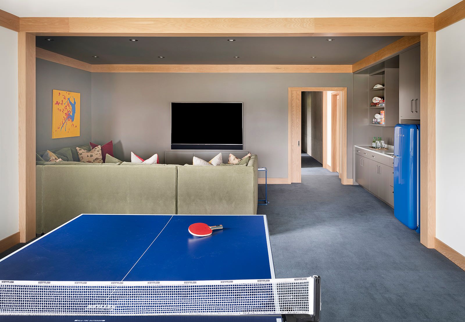 Akin to a pool table but much lighter (and, in some cases, even foldable and on wheels) is the pingpong table. In this Minnesota basement by Rehkamp Larson Architects and Martha Dayton Design, the table coordinates with a bright blue Smeg minifridge in the adjacent kitchenette.