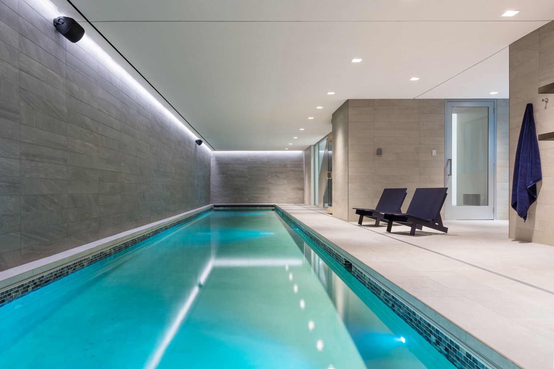 This sleek lap pool, which features natural limestone walls, is in the basement gymnasium of a lakeside mansion — allowing for year-round swimming despite its Minnesota location. (There’s an outdoor pool too.) Designed by architect Charles R. Stinson and built by Streeter Custom Builder, the home has a series of light wells that help brighten the subterranean level.