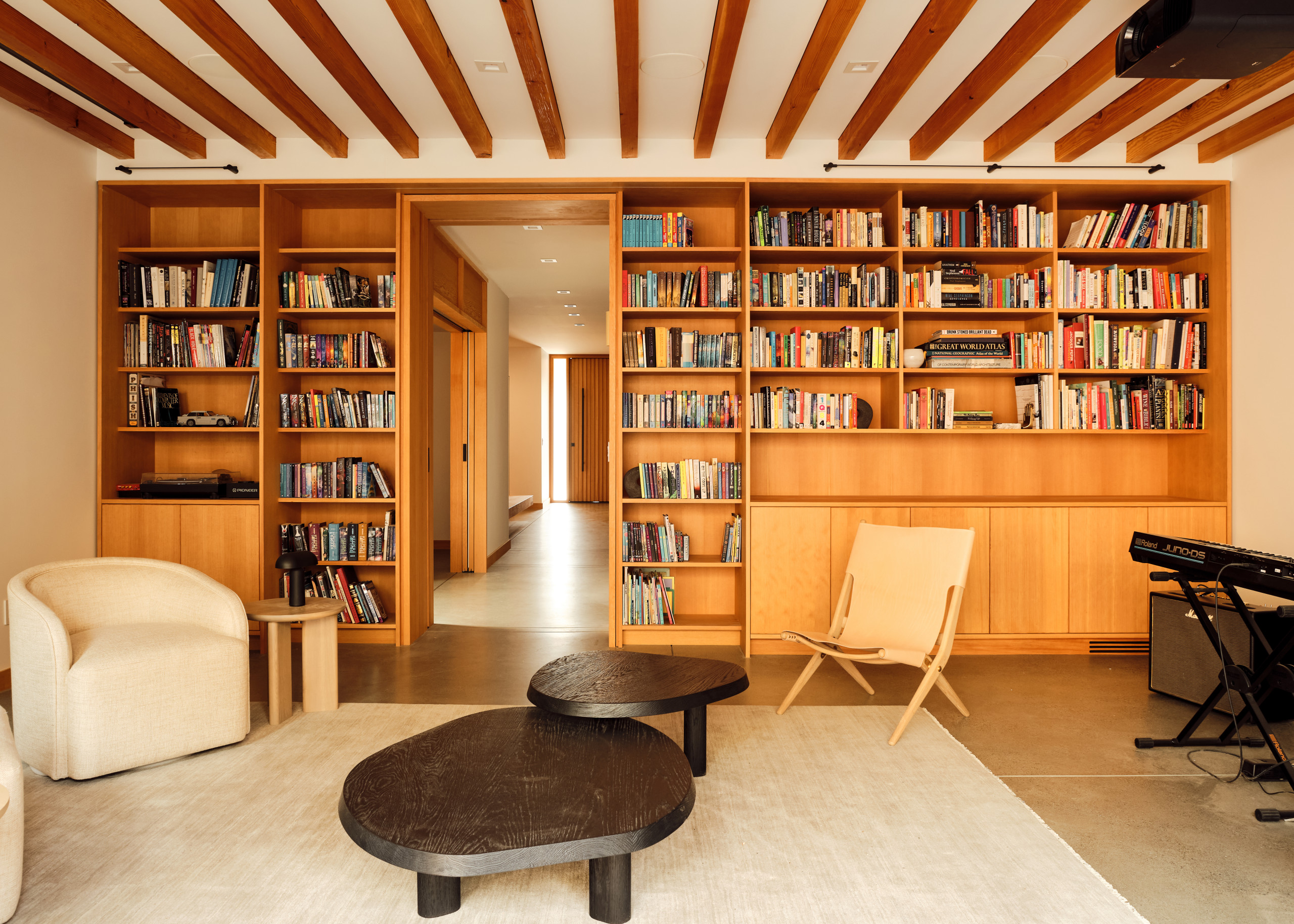 In San Francisco’s Noe Valley, the basement-level remodel that resulted in this space began with a full demolition and excavation of the old foundation and basement. The newly constructed basement has 9-foot ceilings, a radiant-heat system, a bathroom, a laundry, a fitness area, two offices and this library-like lounge area lined with bookshelves custom-built by the project’s general contractor, Joinery Structures.
