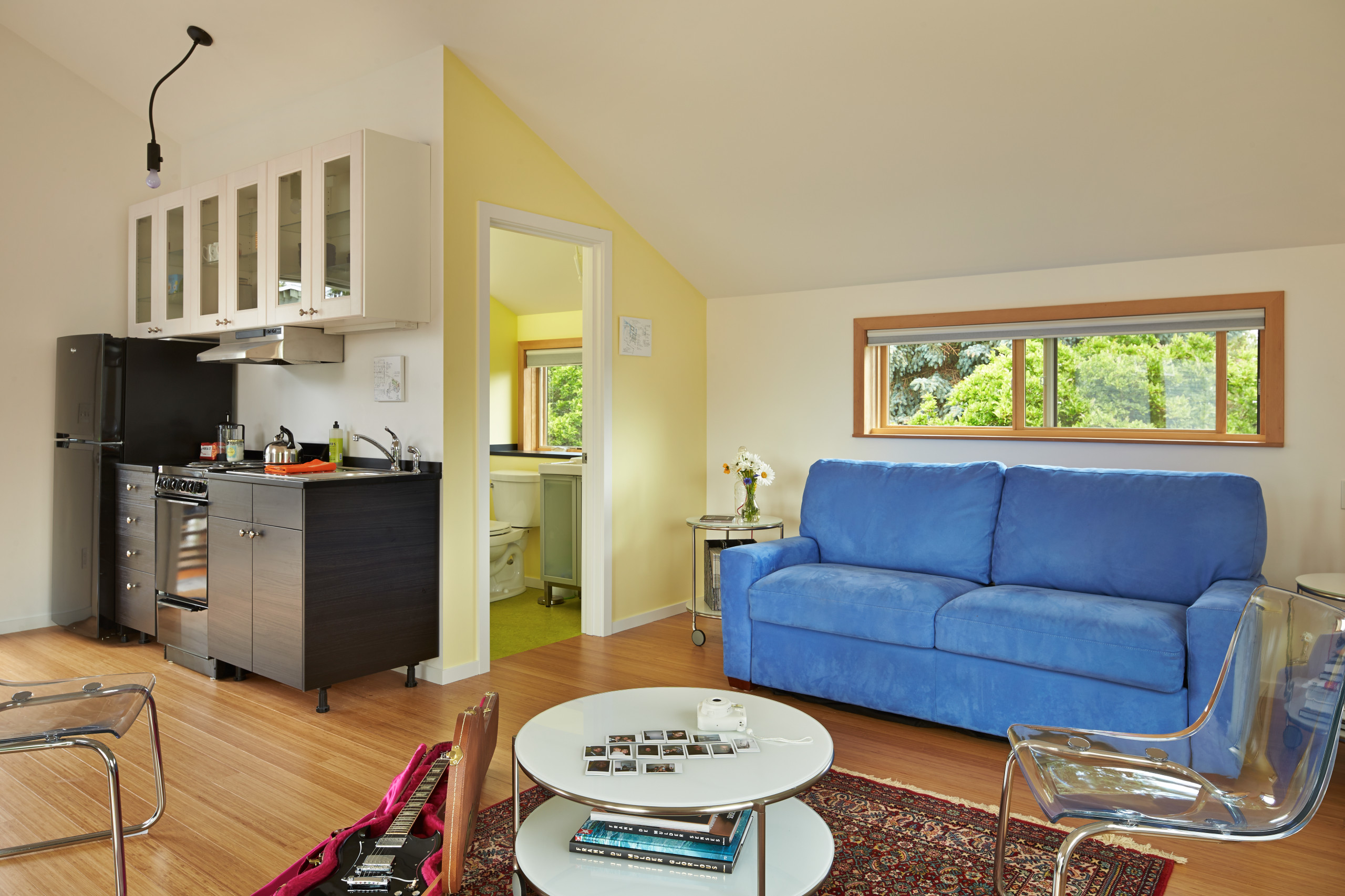 Idea to borrow: Keep living space open. The lack of interior walls (apart from the bathroom) makes this ADU feel open and spacious. The sofa pulls out to a bed, which the owners use occasionally for guests, but the space is primarily used as a grown-up hangout spot and music room.