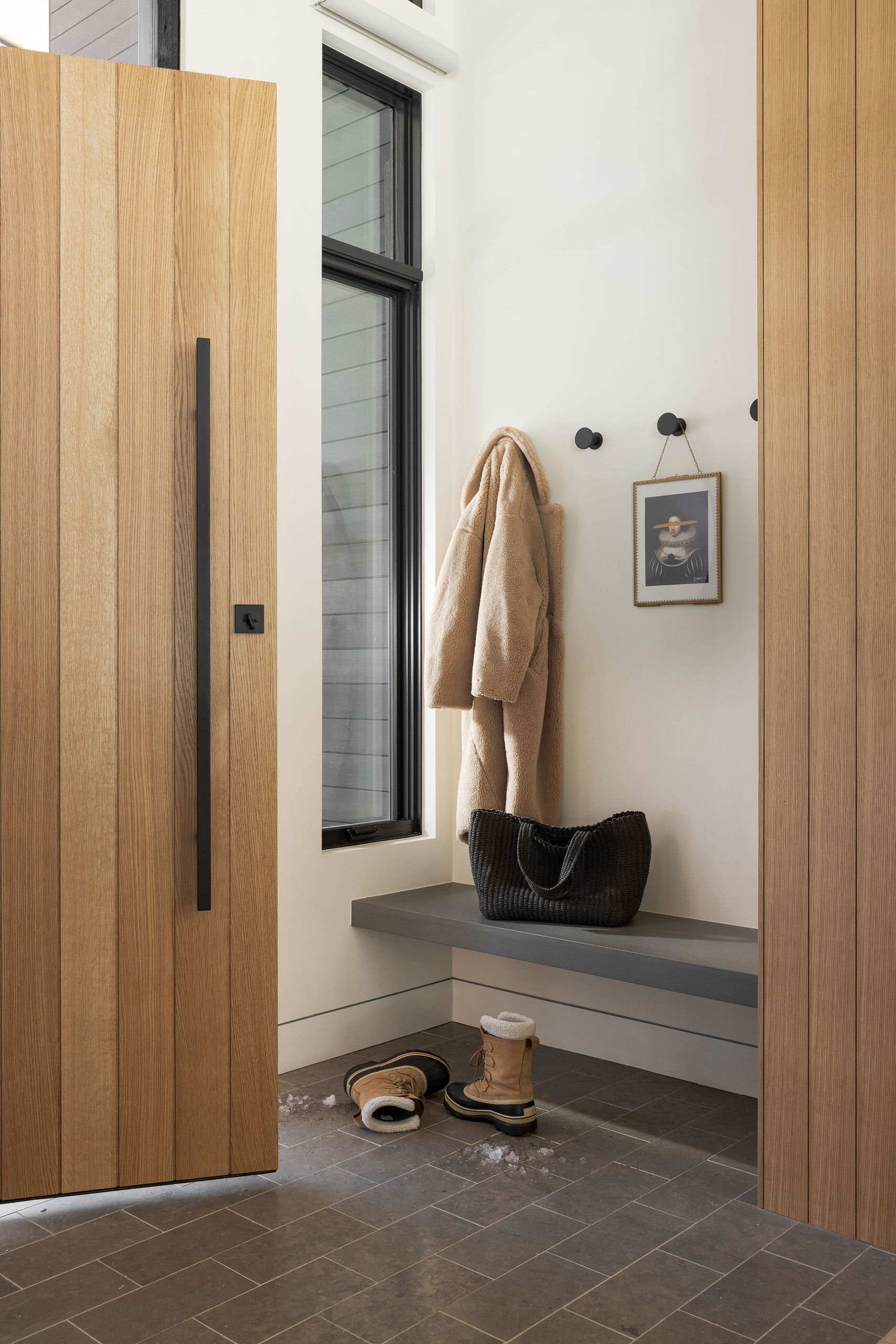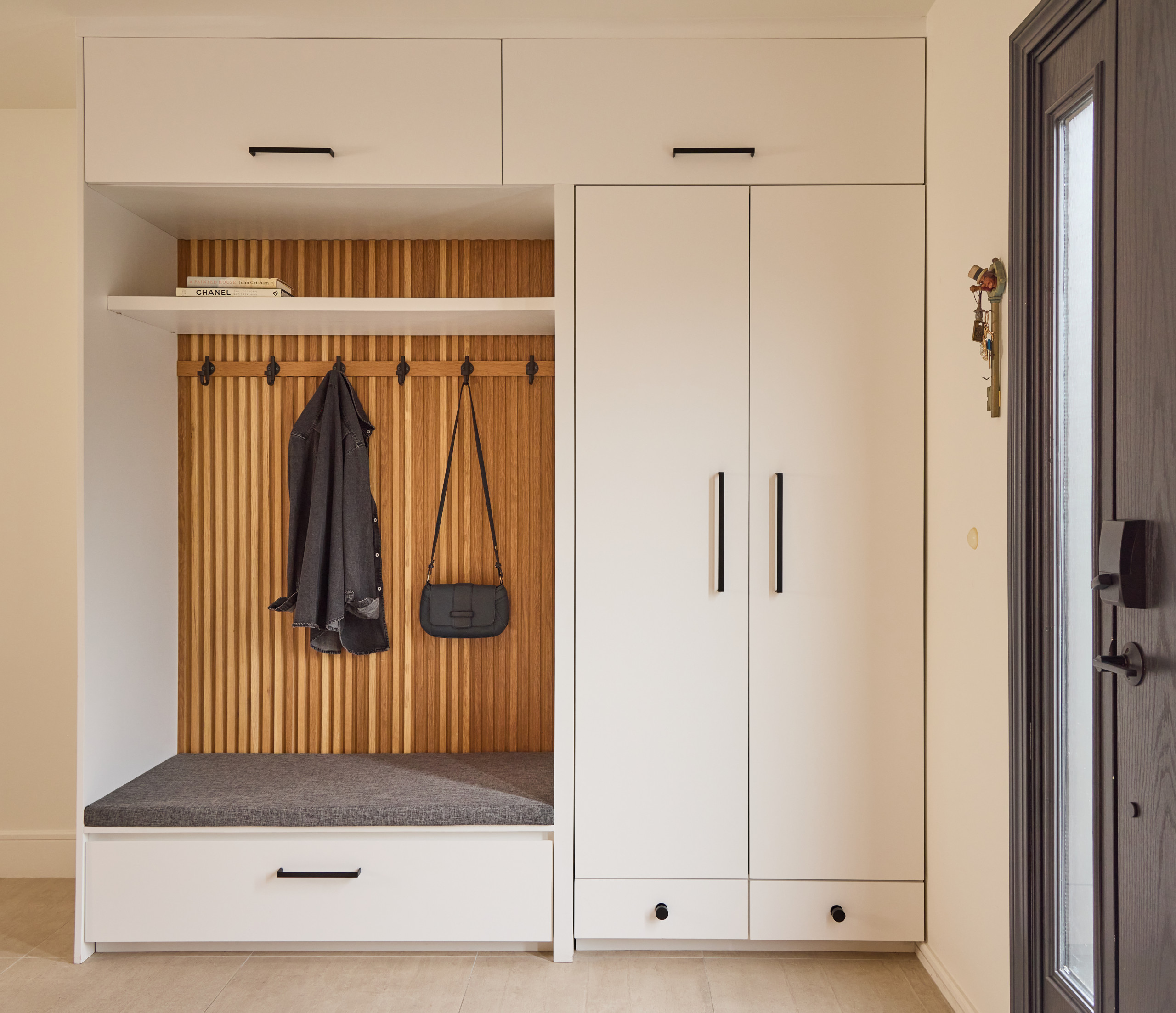 In the compact entry seen here, the floating wood-wrapped bench would have made a significant impression all on its own. But the wood slats have been taken up the wall from floor to ceiling, adding visual texture and accentuating the height of the area rather than its width, creating the appearance of more space.