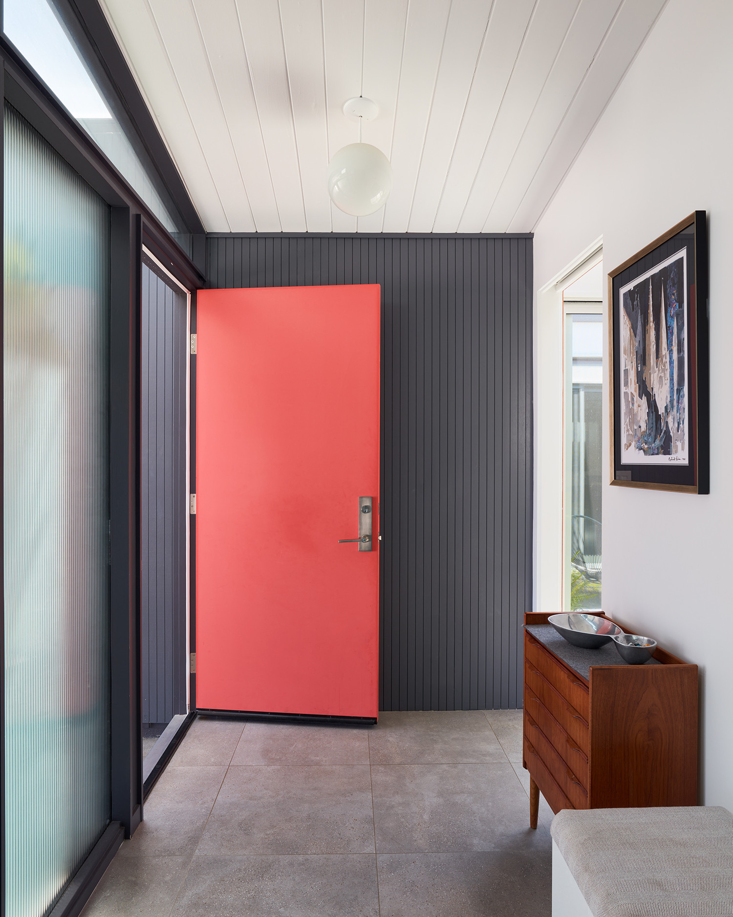 But remember, the interior side of your door also will be on display indoors. So it’s a chance to integrate a bold color into the entry decor — and you can use the color as a jumping-off point for accessories and accents.