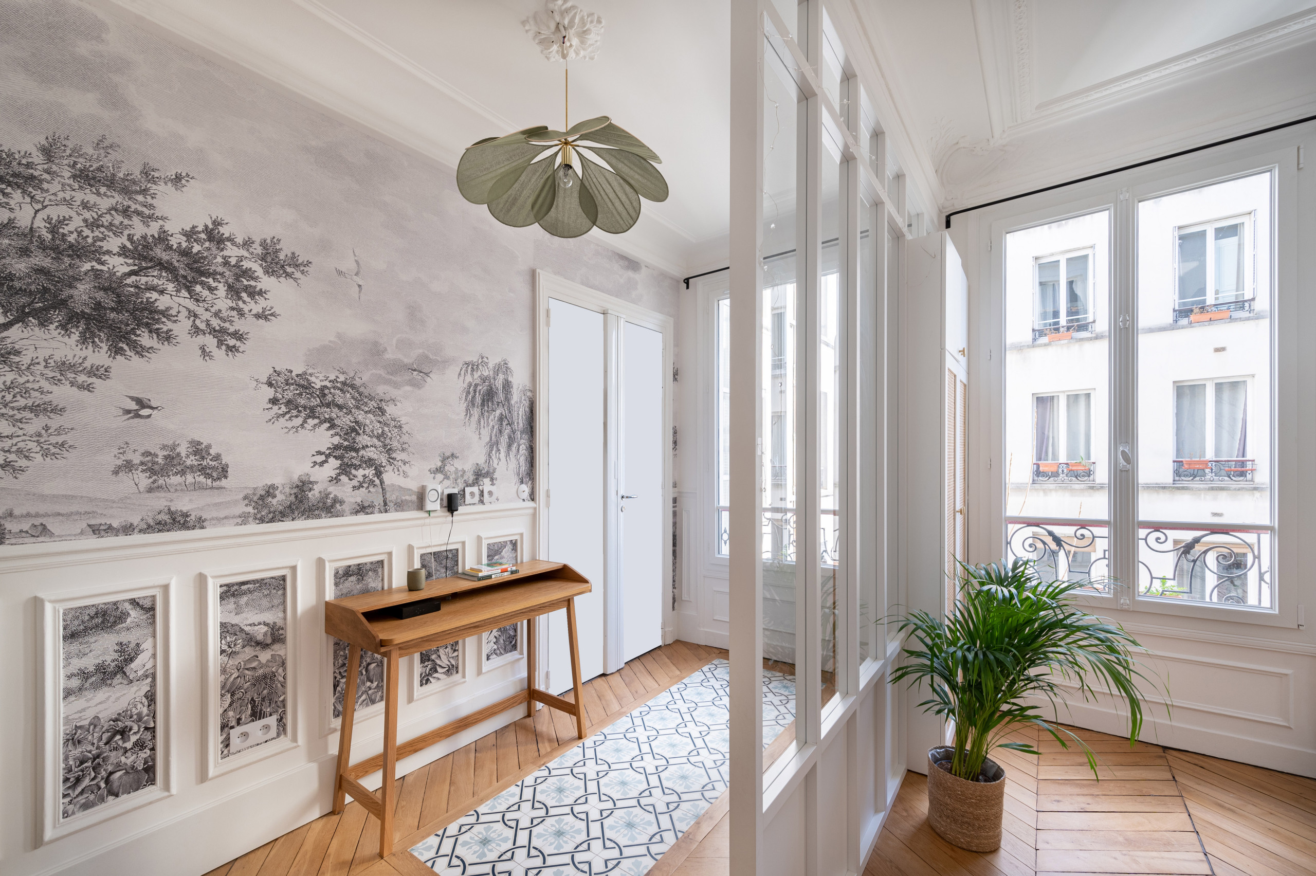 You can still set off your entry while creating design cohesion. Here, beautiful wall paneling runs throughout the entry and into the home, as does the chevron-pattern wood flooring. But a glass panel wall divider, an exquisite mural and an inset tile “rug” define the entry.